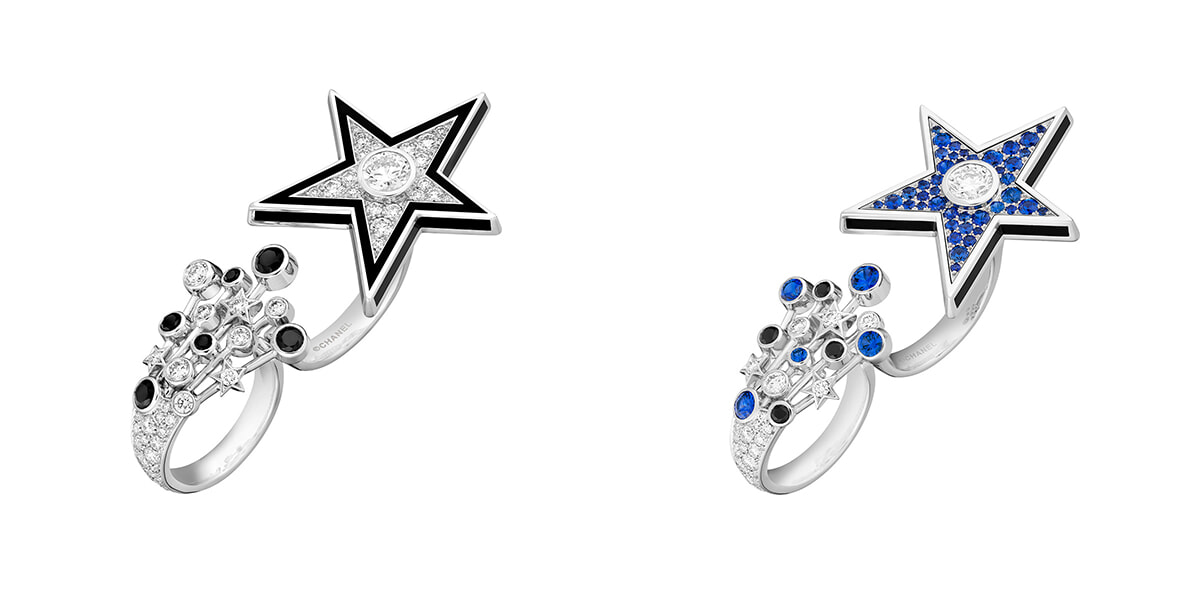 コメットが輝くツーフィンガーリングは手元を彩るジュエリーの象徴的存在。左:リング「ファイブ スターズ」(WG×ダイヤモンド×ブラックスピネル×ブラックラッカー)¥19,910,000 右:同(WG×ダイヤモンド×サファイア×ブラックスピネル×ブラックラッカー)¥19,140,000(ともに参考価格)/ともにシャネル
