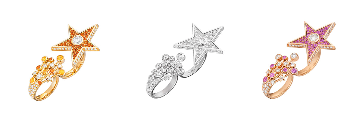 ダイヤモンドの輝きが際立つモノクロームトーンに加え、オレンジやピンク系のゴールデンアワーを表現したリングも展開。左:リング「ファイブ スターズ」(YG×ダイヤモンド×ガーネット×ラッカー)¥19,140,000 中:同(WG×ダイヤモンド)¥21,450,000 右:同(PG×ダイヤモンド×ピンクサファイア)¥20,680,000(すべて参考価格)/以上シャネル