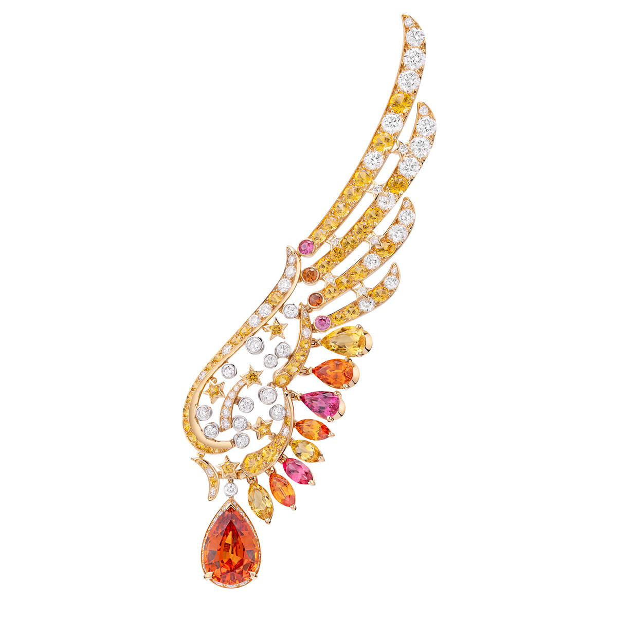 沈みゆく太陽の光の一雫を反映したようなストーン使いが印象的。ブローチ「スターズ サニーデイズ」(YG×PG×PT×ダイヤモンド×イエローサファイア×スペサルタイトガーネット×イエローペリル×ピンクスピネル)¥84,260,000(参考価格)/シャネル