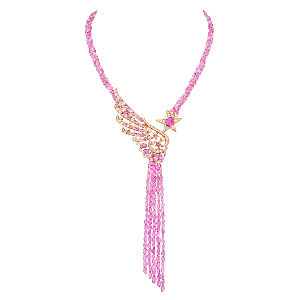日没前、空がピンク色に染まる瞬間の色彩をロマンティックなネックレスに。ネックレス「ピンク アワー」(PG×ダイヤモンド×ピンクサファイア×ピンクサファイア ビーズ)¥58,190,000(参考価格)/シャネル