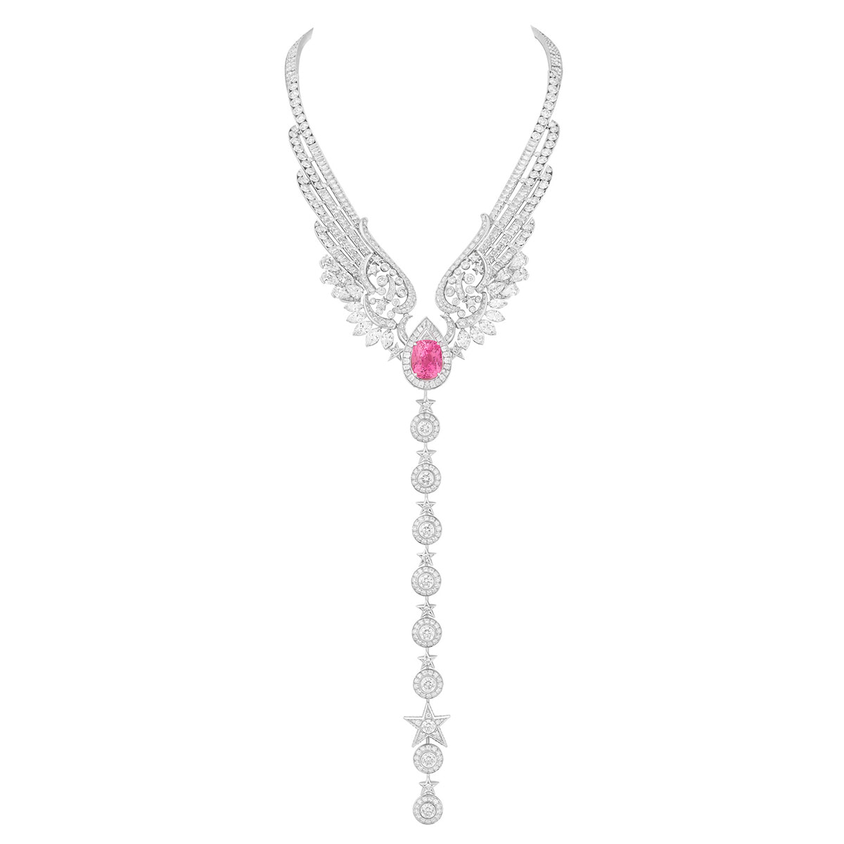 ダイヤモンドの翼が広がるように首元を包み込むネックレスは、19.55カラットのパパラチアサファイアがピンクとオレンジの優美なハーモニーを奏でる。パーツを取り外してブレスレットとしても着用可能。ネックレス「ウイングス オブ シャネル」(WG×プラチナ×ダイヤモンド×パパラチアサファイア)¥1,684,320,000(参考価格)/シャネル