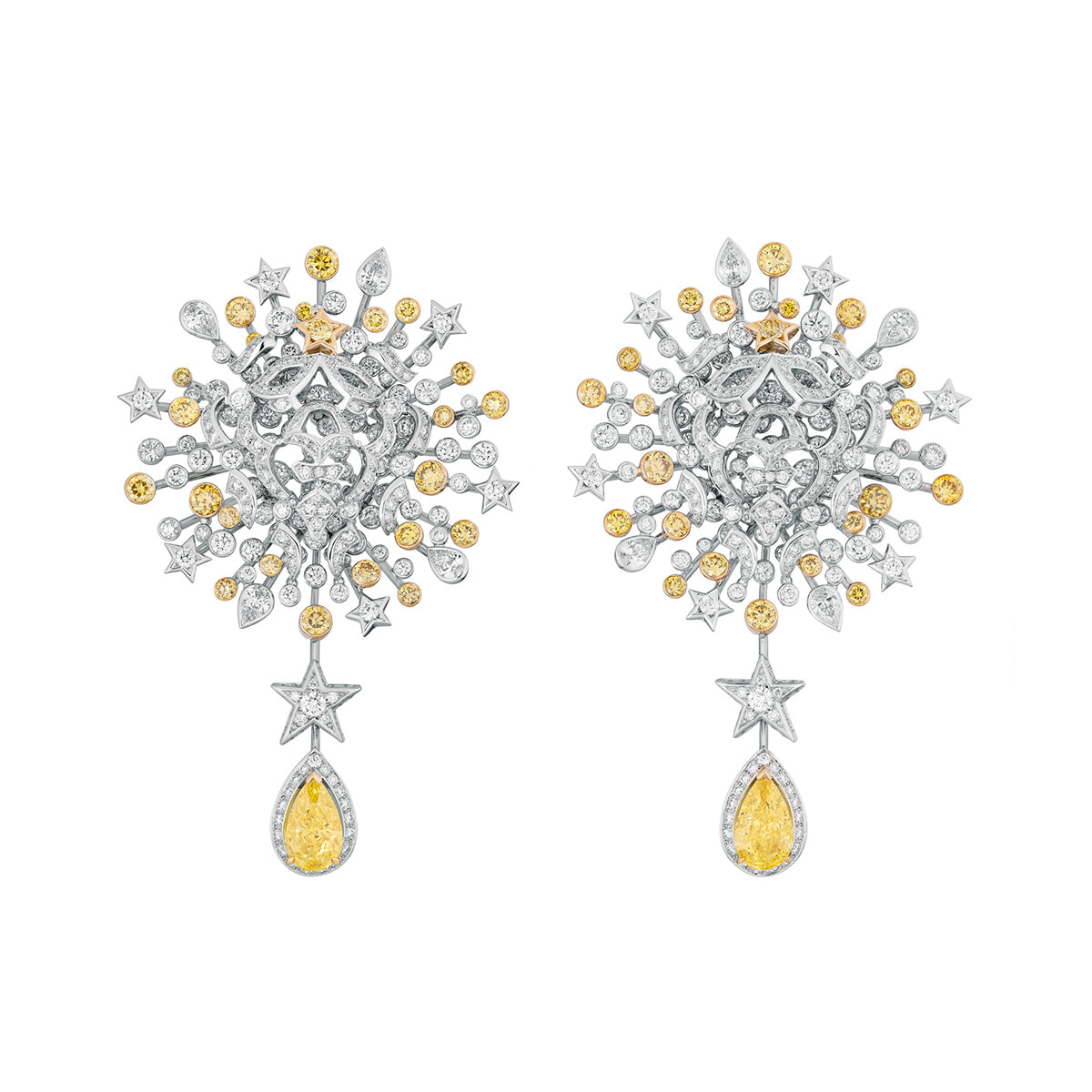 ホワイトとイエローのダイヤモンドがセットされ、繊細なレースのように仕立てられたホワイトゴールドのライオンがオーラを放つ。イヤリング「ストロング アズ ア ライオン」(WG×YG×ダイヤモンド×イエローダイヤモンド)¥199,100,000(参考価格)/シャネル