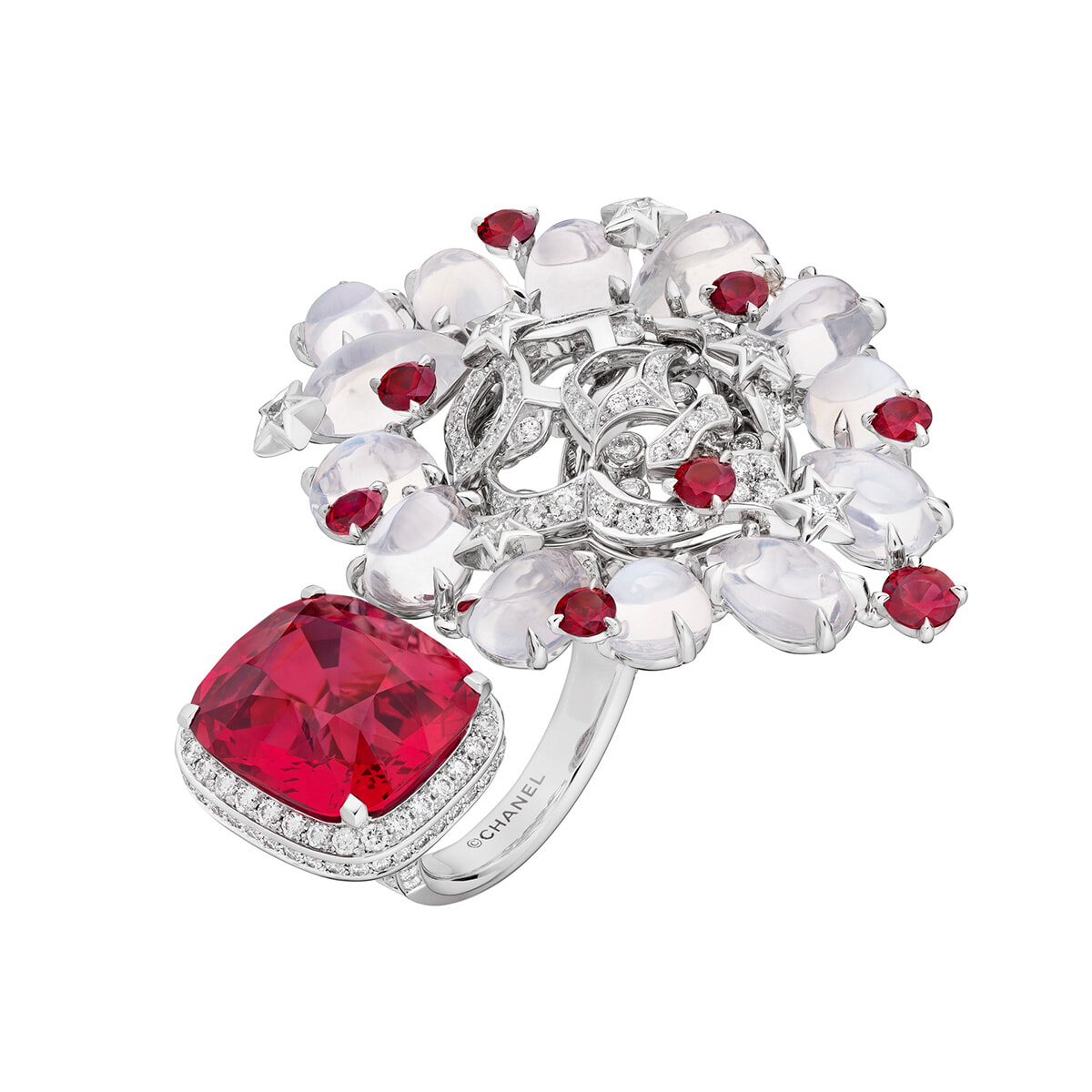ムーンストーンとルビーのたてがみを持つライオンの横には11.28カラットものクッションカットのレッドスピネル。リング「フォロー ユア ハート」(PT×ダイヤモンド×レッドスピネル×ルビー×ムーンストーン)¥183,700,000(参考価格)/シャネル