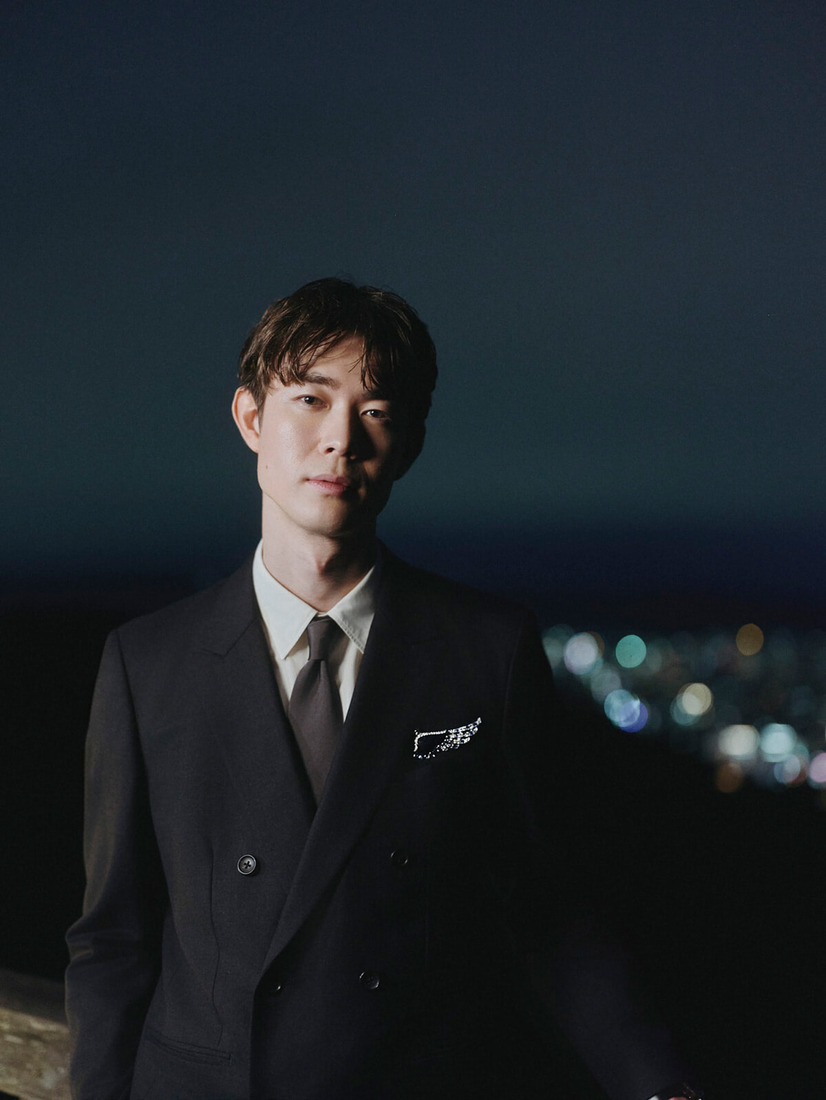 シャネルのアンバサダーの宮沢氷魚。18KWG、ダイヤモンド、サファイアに京都の職人が制作した漆をセットした「ファイブ ウイングス」ブローチを着用。©CHANEL