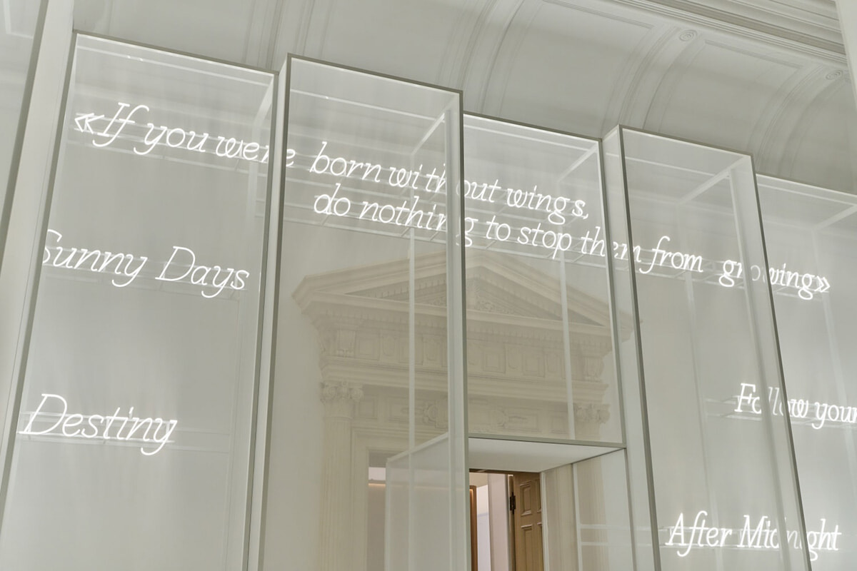エントランスを入ると最初に目に入るのは、マドモアゼル シャネルの言葉が壁一面に並べられたインスタレーション。©CHANEL