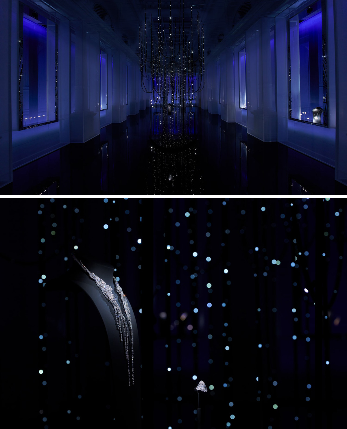 まるで夜空に浮かんでいる星々が煌めくような空間で展示されたジュエリー。©CHANEL