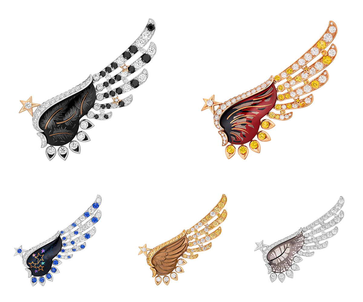 京都の漆職人とタッグを組んだ「ファイブ ウイングス ブローチ」は全5種。蒔絵や螺鈿を取り入れた漆細工を嵌め込み、ジェムストーンとの組み合わせでデザインが異なり、豊かな表情を見せる。(写真上)左:ブローチ「ファイブ ウイングス」(WG×YG×ダイヤモンド×ブラックスピネル×漆) 右:同(PG×ダイヤモンド×イエローサファイア×スペサルタイトガーネット×漆)(写真下)左:同(WG×サファイア×漆)、中:同(YG×ダイヤモンド×イエローサファイア×漆)¥30,580,000、右:同(WG×ダイヤモンド×漆)各¥30,580,000(すべて参考価格)/以上シャネル