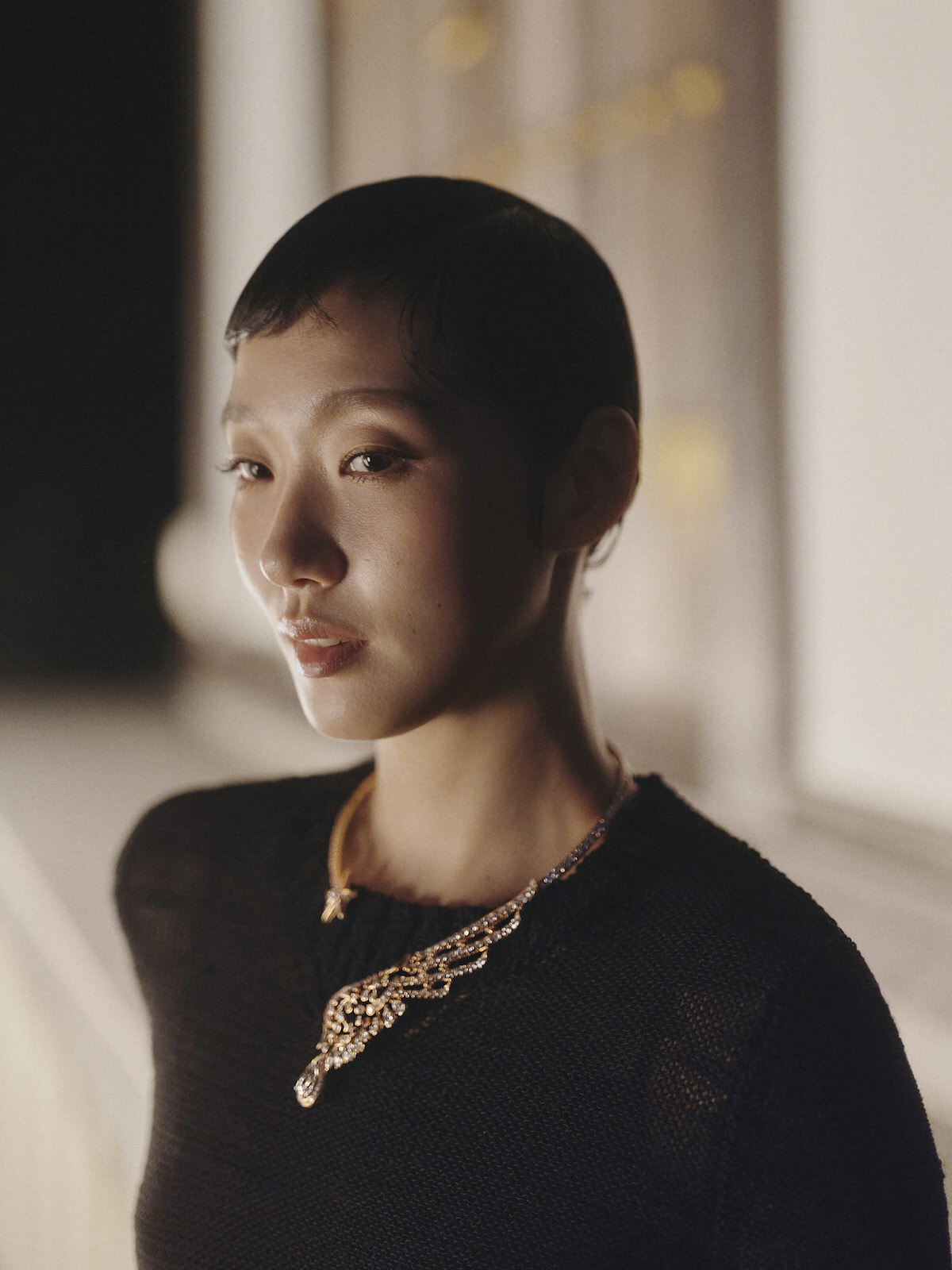 シャネルのアンバサダーのキム・ゴウン。18KPGとダイヤモンドの「ワイルド アット ハート」ネックレス、2024/25年メティエダール コレクションからゴールドのラインが美しいブラックのニットドレスを着用。©CHANEL