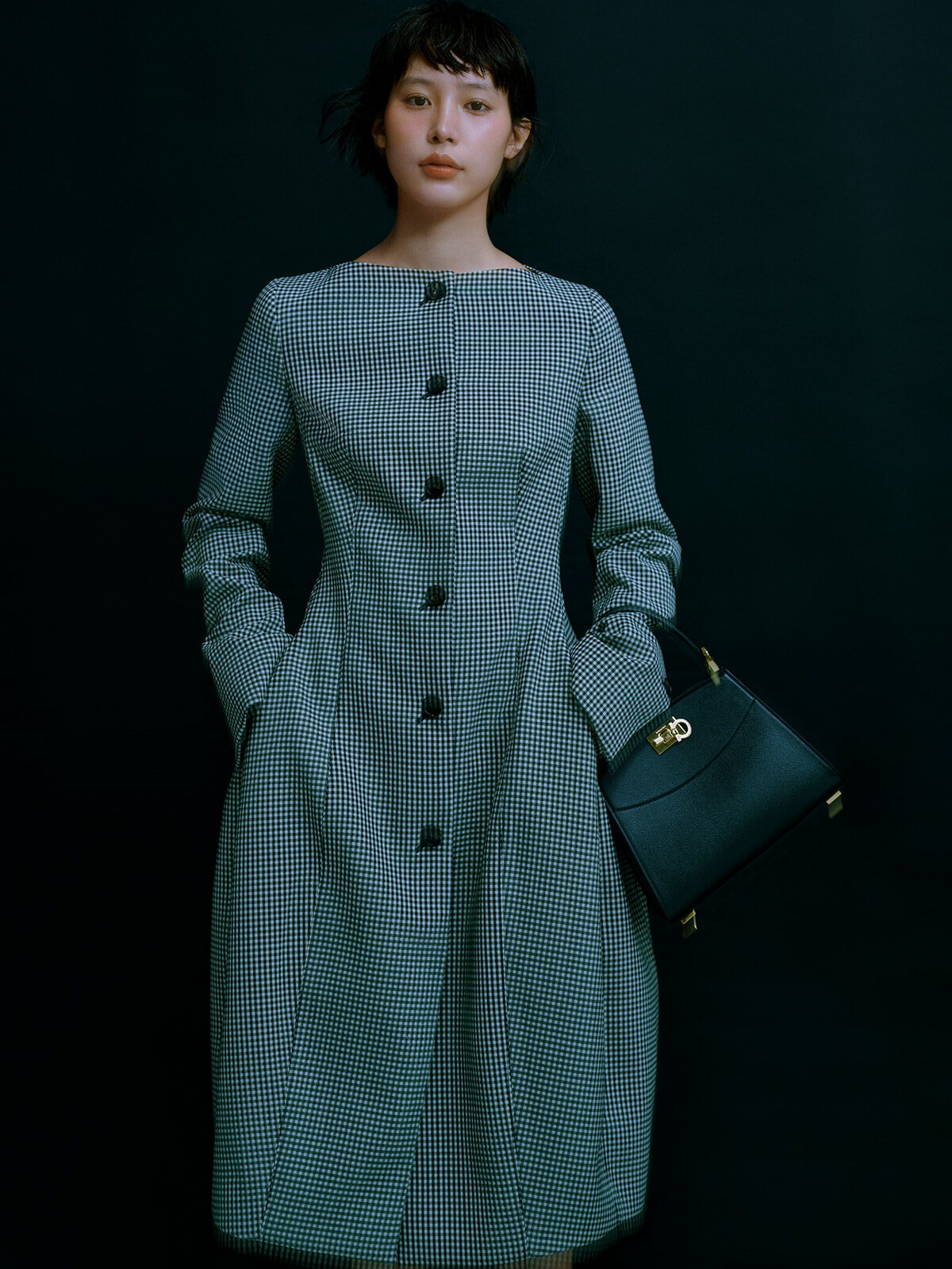 ドレスのように纏うのは、70年代のテーラードをテーマにしたダブルフェイスのコート。どこかノスタルジックなギンガムチェックがクラシカルなレディを演出してくれる。手元にはトップハンドルバッグを添えて、時代を超えるエレガンスを完成させて。