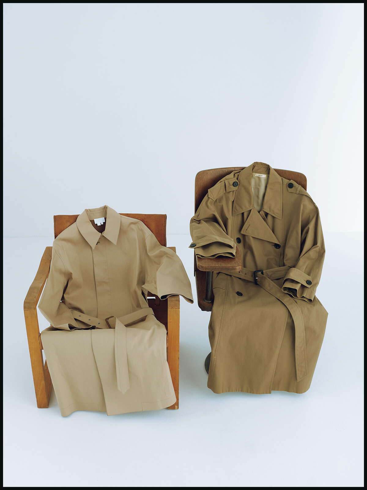 コートはタイムレスなデザインを選ぶのが上杉流。「右のセリーヌのトレンチコートは佇まいの美しさと色に魅せられて購入。左のステンカラーコートは、アー・ペー・セー×スザンヌ・コラーのもので、ウエストベルトの位置が低いところがジェントルマンライクで気に入っています」