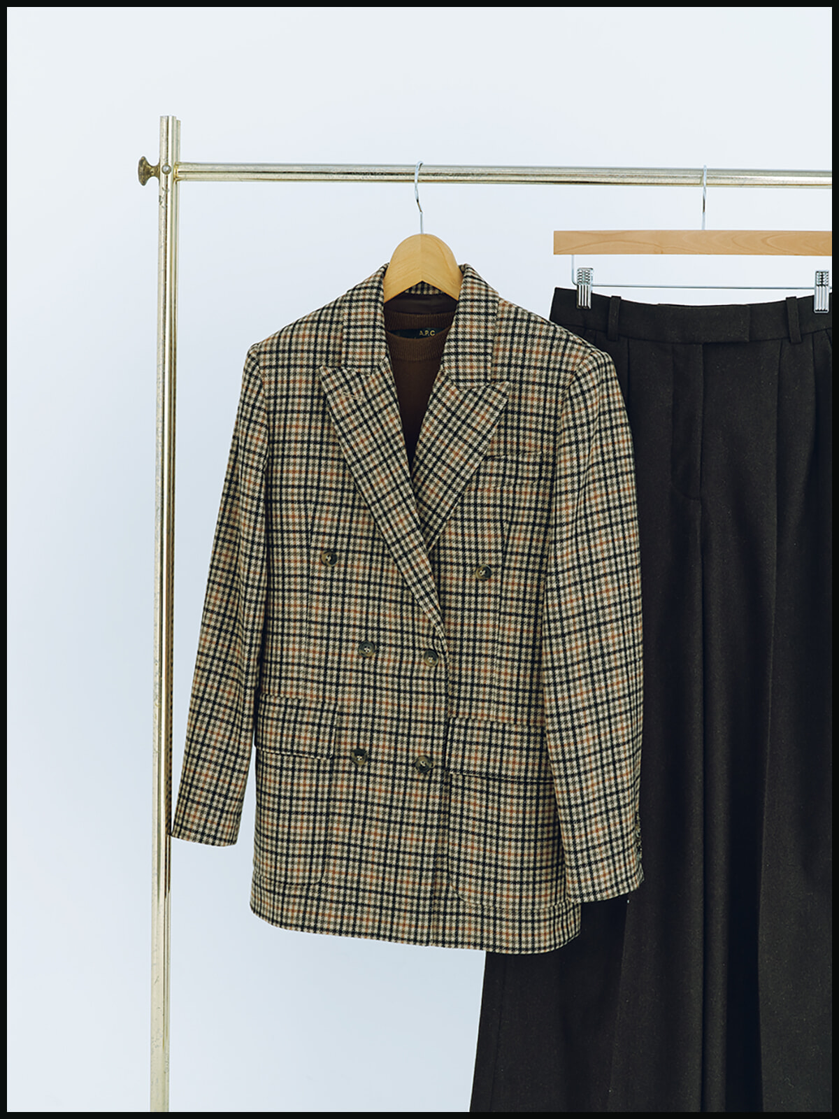 今年のコラボコレクションから、チェックのダブルブレストジャケット、ブラウンニット、ワイドパンツをセレクト。「アー・ペー・セー代官山のウィンドーディスプレイで偶然見かけて。マスキュリンなアイテムなのに、纏うことで、不思議と内に秘めるフェミニニティを引き出すことができる。二面性を持ったスタイルはまさにフレンチシックです」