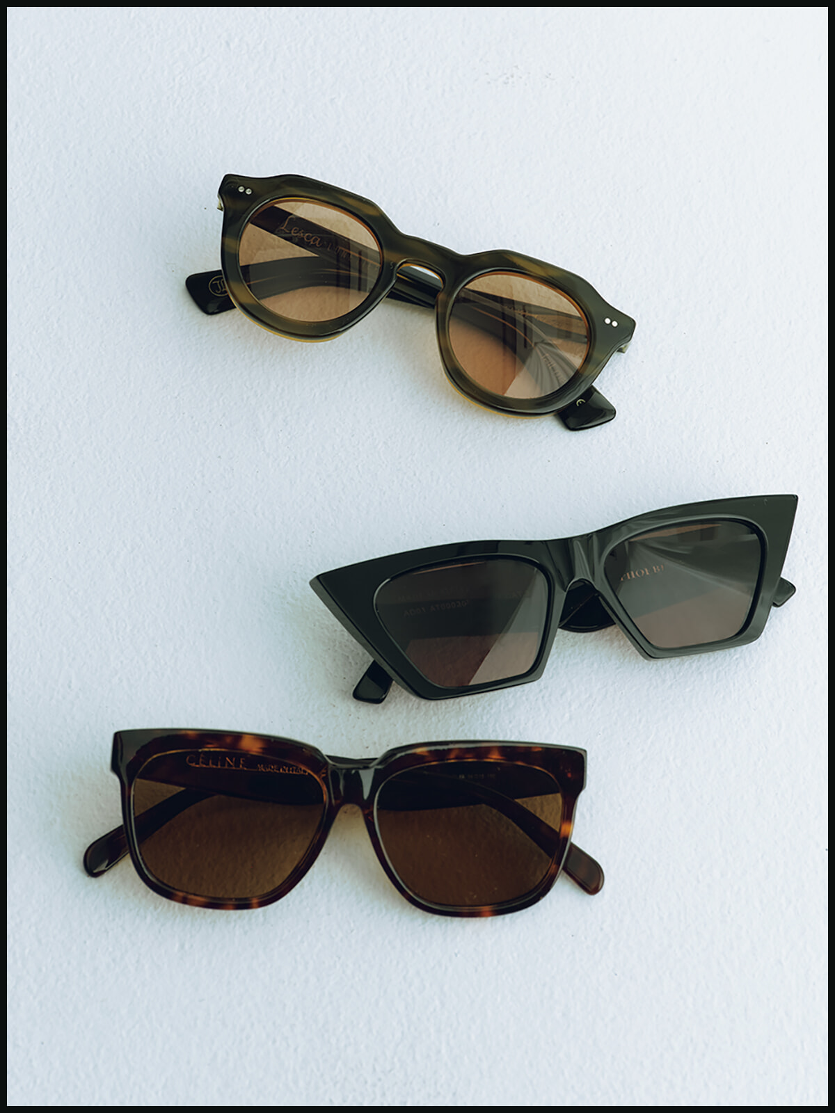 「パリジェンヌにとってサングラスは個性を表すための必需品」。上から、珍しい色と肉厚なデザインに惹かれたというレスカ、ミラノで手に入れたシャープなフォルムのフィービー ファイロ、パリで購入したセリーヌ。