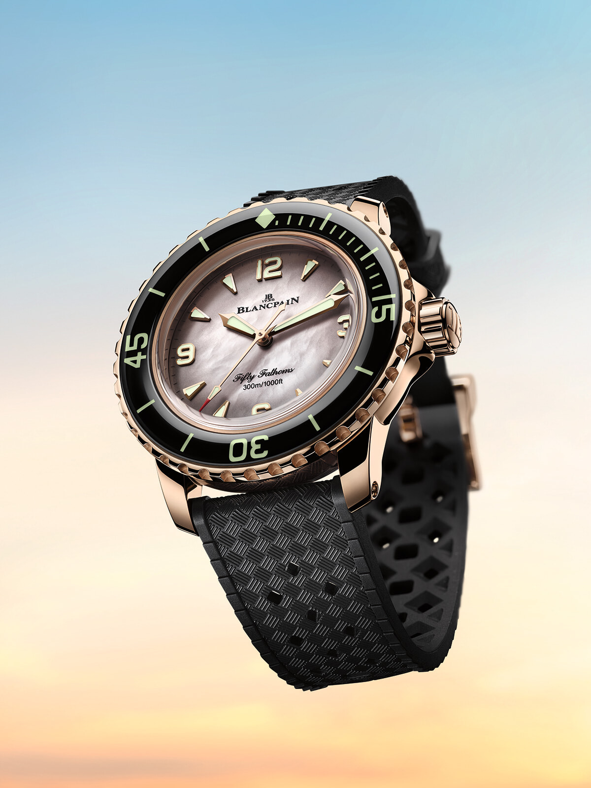 画像のストラップはブラックのトロピックラバー。ほかにブラックのセイルキャンバス、またはブラックのNATOストラップも揃う。ウォッチ「フィフティ ファゾムス オートマティック」(∅38mm、18Kレッドゴールド×マザー オブ パール)¥4,675,000/ブランパン ブティック 銀座