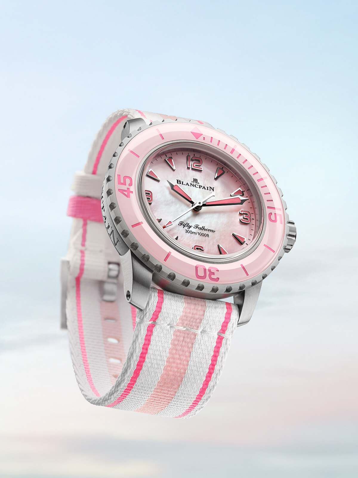 ピンクモデルには、ピンクのツートーンストライプをあしらったスポーティーなホワイトの布製ストラップを採用。ウォッチ「フィフティ ファゾムス オートマティック」(∅38mm、グレード23 チタン×マザー オブ パール)¥2,508,000/ブランパン ブティック 銀座