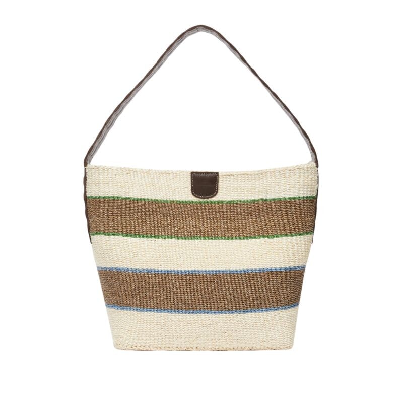 ブルーとグリーンを取り入れたボーダーと深みのあるブラウンカラーのレザーベルトが上品にマッチ。サイザル麻の涼しげな風合いと裏地なしの軽やかさが夏にぴったり。スナップボタン式の大きな開口部で使いやすく、イントレチャートレザーのハンドルは肩掛けにも。