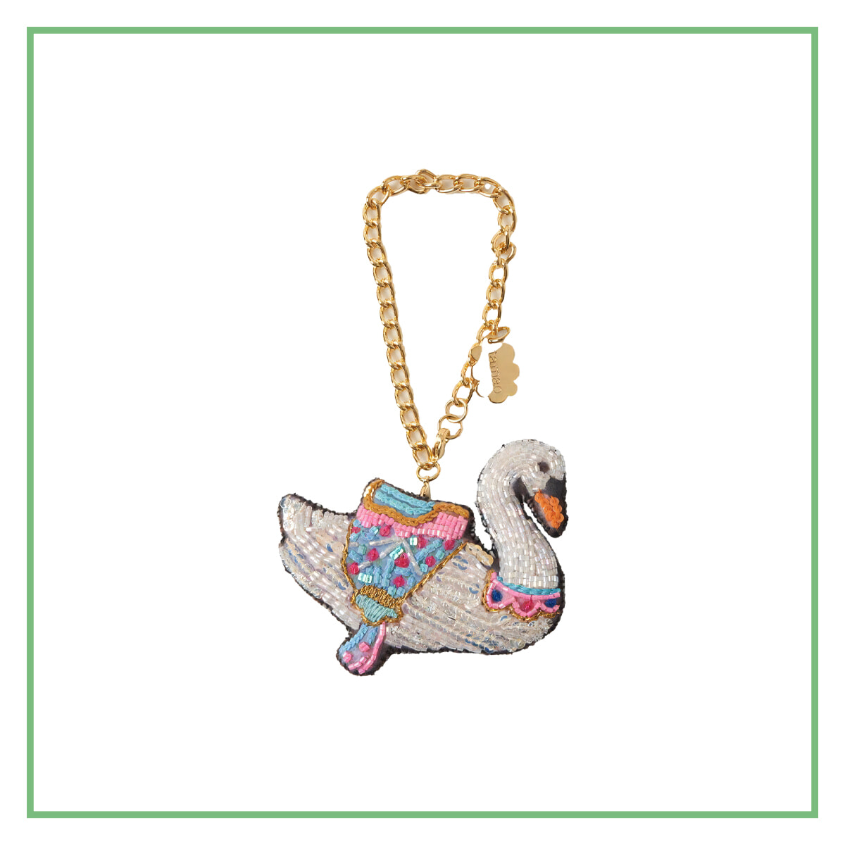 物語に登場するスワンをビーズ刺繍で繊細に表現。取り外し可能なモチーフはブローチとしても楽しめる。