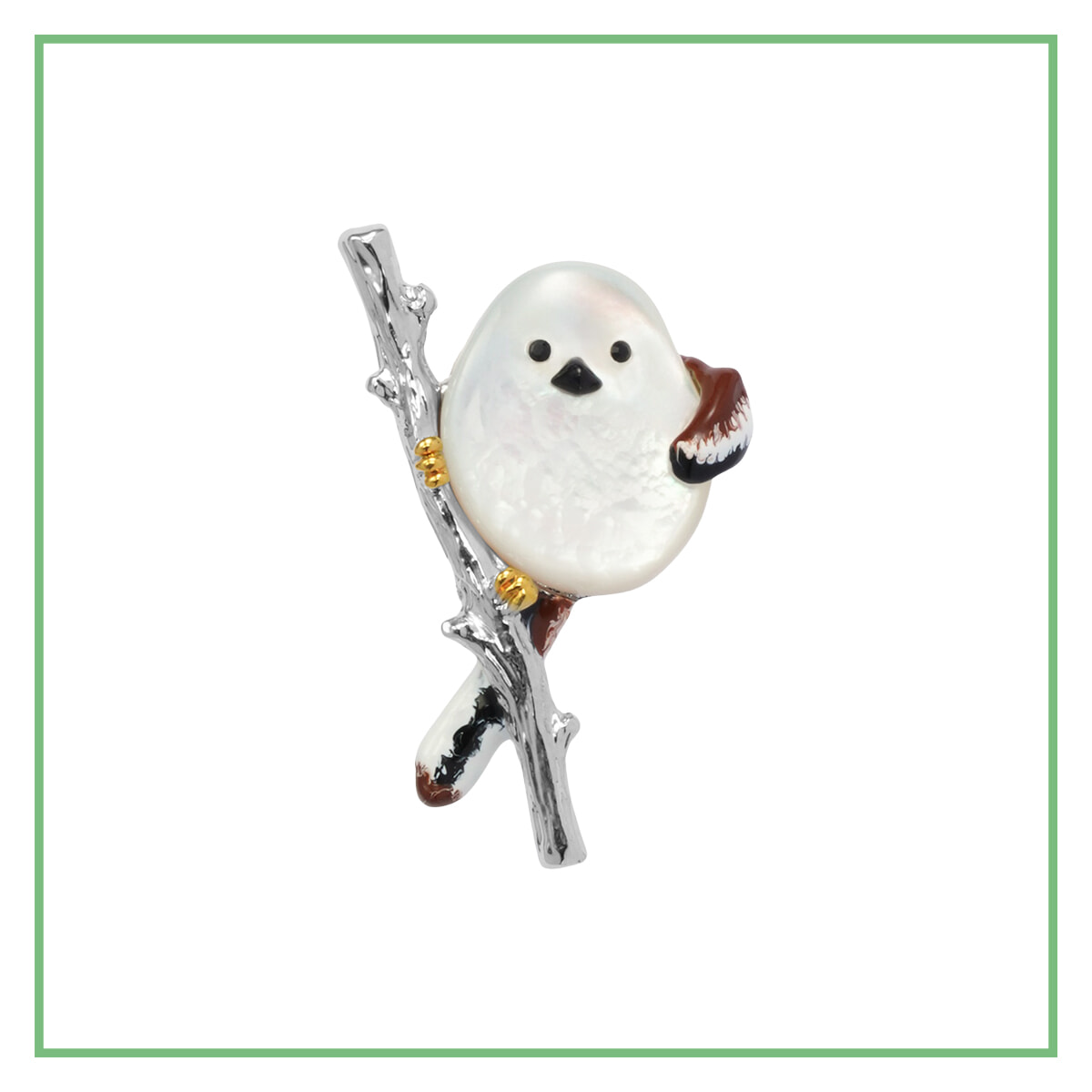 つぶらな瞳で見つめるシマエナガ。白蝶貝の放つ幻想的な虹色の輝きに心がときめく、愛らしいブローチ。