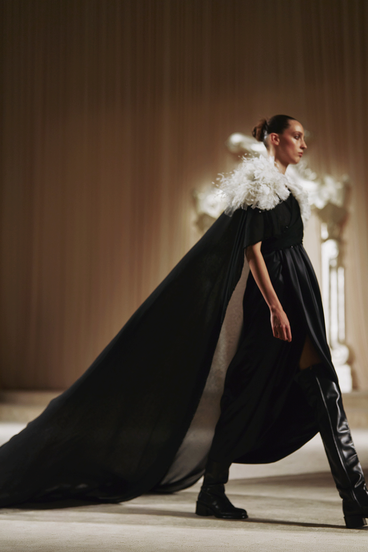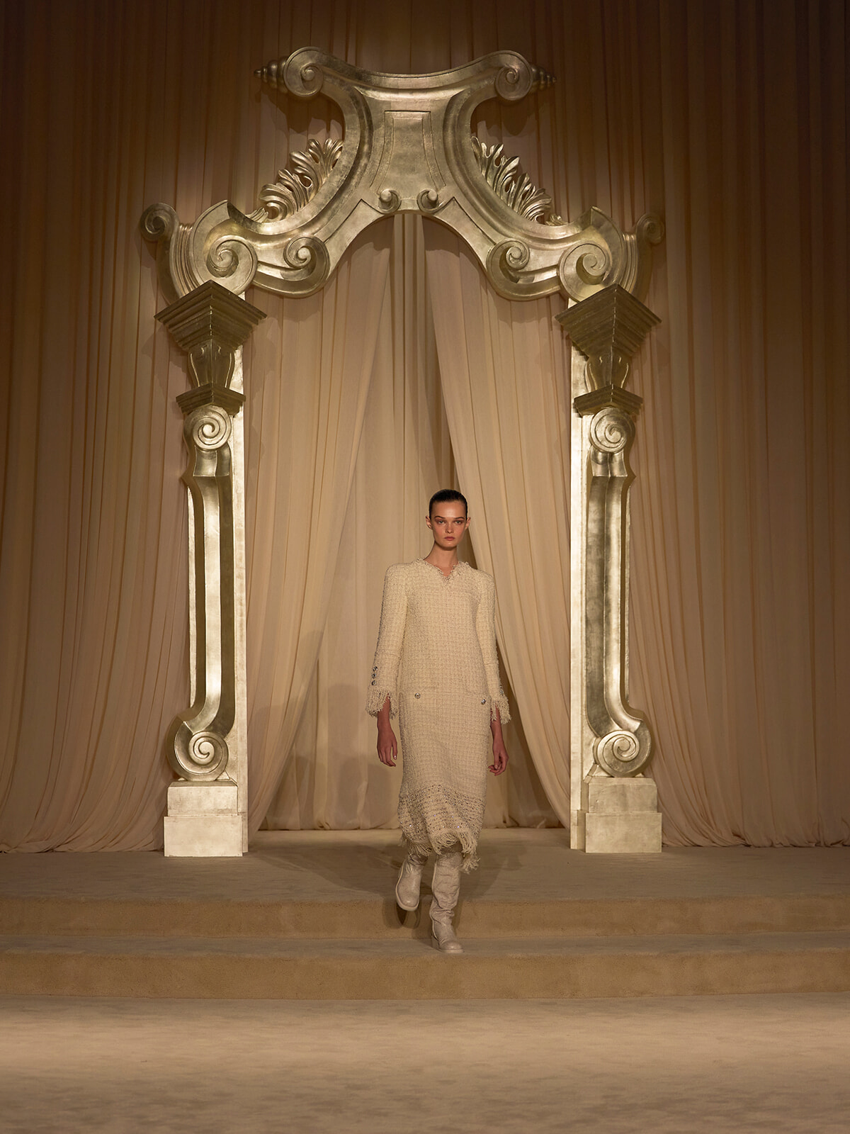 その美学は、舞台美術を手がけるウィロ・ペロンによって静謐な舞台美術にも反映されている。メゾン設立当初のオートクチュール サロンを彷彿とさせるセットを舞台に、エクリュやアイボリーをはじめとした自然を思わせる色調に彩られたシルエットが次々と登場し、ショーが幕を開ける。