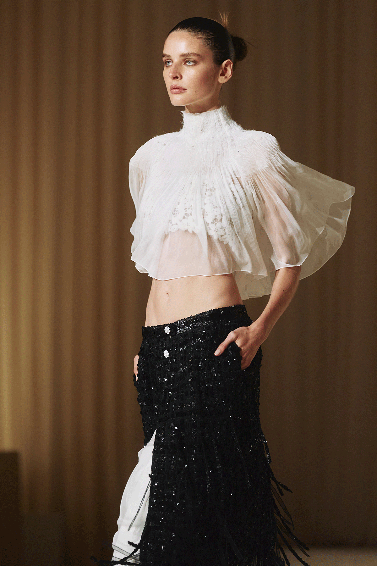 イギリスの田園風景やスコットランドの荒野からもインスピレーションを受けていたガブリエル・シャネル。自然界の空の移り変わりを思わせるグラデーションの色合いや夜空を想起させる煌めきは、今コレクションに登場するイヴニングウエア群にも美しく反映され、風をはらんで自由に動き回る柔らかな生地のテクスチャーも美しい。