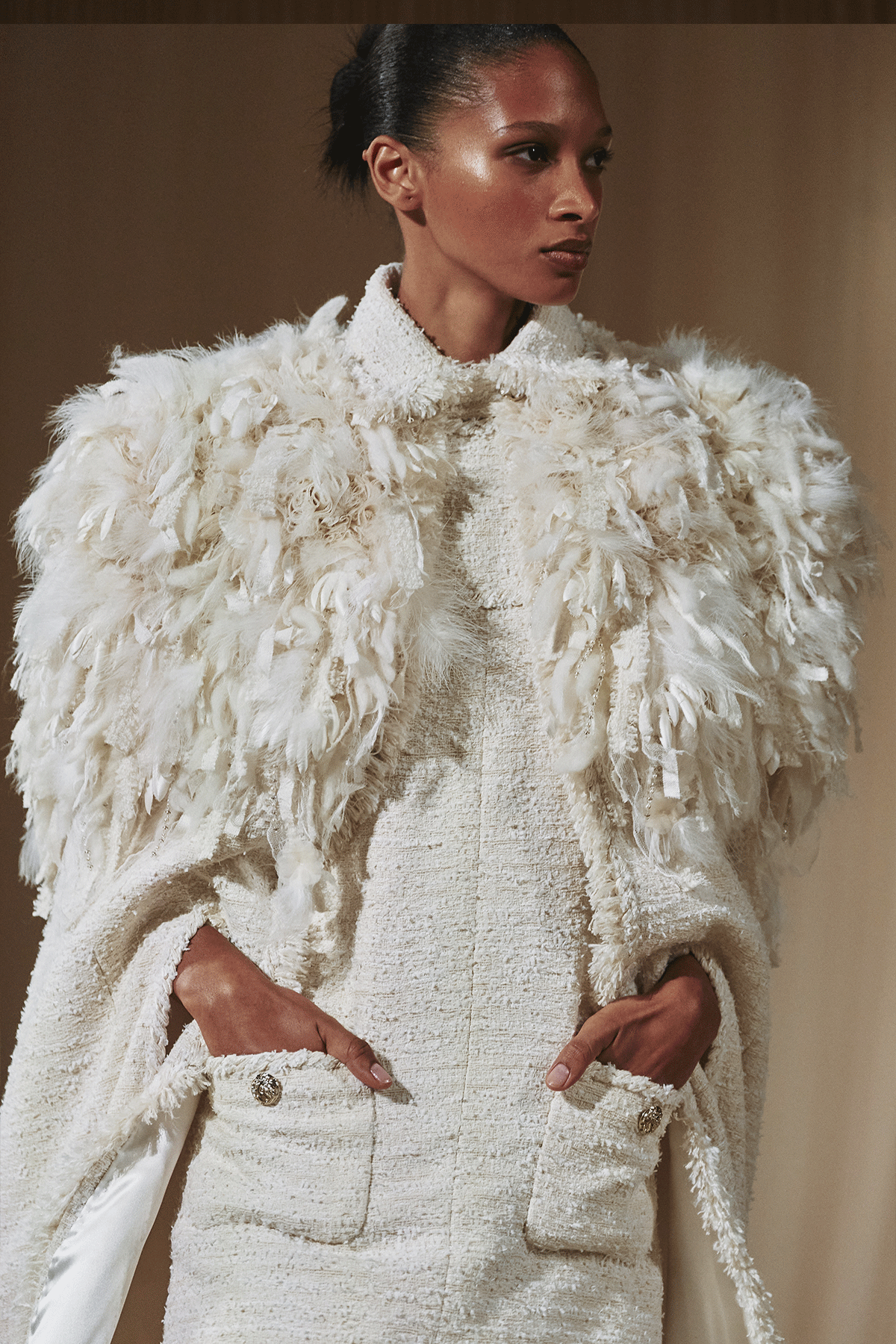さらにフェザーと組み合わせたツイードが主役のパンツスーツやロングコート、刺繍が施されたオーバーケープやショート丈のブルゾン ジャケットは、まるでファーのような質感に仕上がっている。