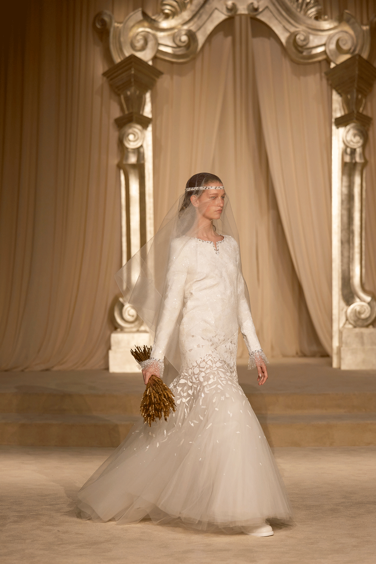 そして、このコレクションの世界観を完成させる重要な要素がガブリエル・シャネルの大切にしていた”麦の穂”のモチーフだ。豊かさを想起させるこのモチーフは、刺繍やジュエルボタンのディテールとして随所に登場し、アトリエのサヴォアフェールをさりげなく際立たせている。シフォンのフラウンスに織り込まれたフェザーや、ウェディングドレスのネックラインに沿った繊細な刺繍は、まるで風にそよぐ麦の穂のよう。さらにピーコートやサテンクレープのエプロンドレスに施されたマルチカラーの花柄刺繍で、今季の牧歌的テーマを表現している。そして最後に、太陽の光を浴びるようなゴールドのジュエルボタンや刺繍、シルバーとゴールドの高貴なレース、オレンジのラメがあしらわれたフラウンスのドレスが登場し、メゾンのさりげなくも洗練された、格別の世界観を披露した。