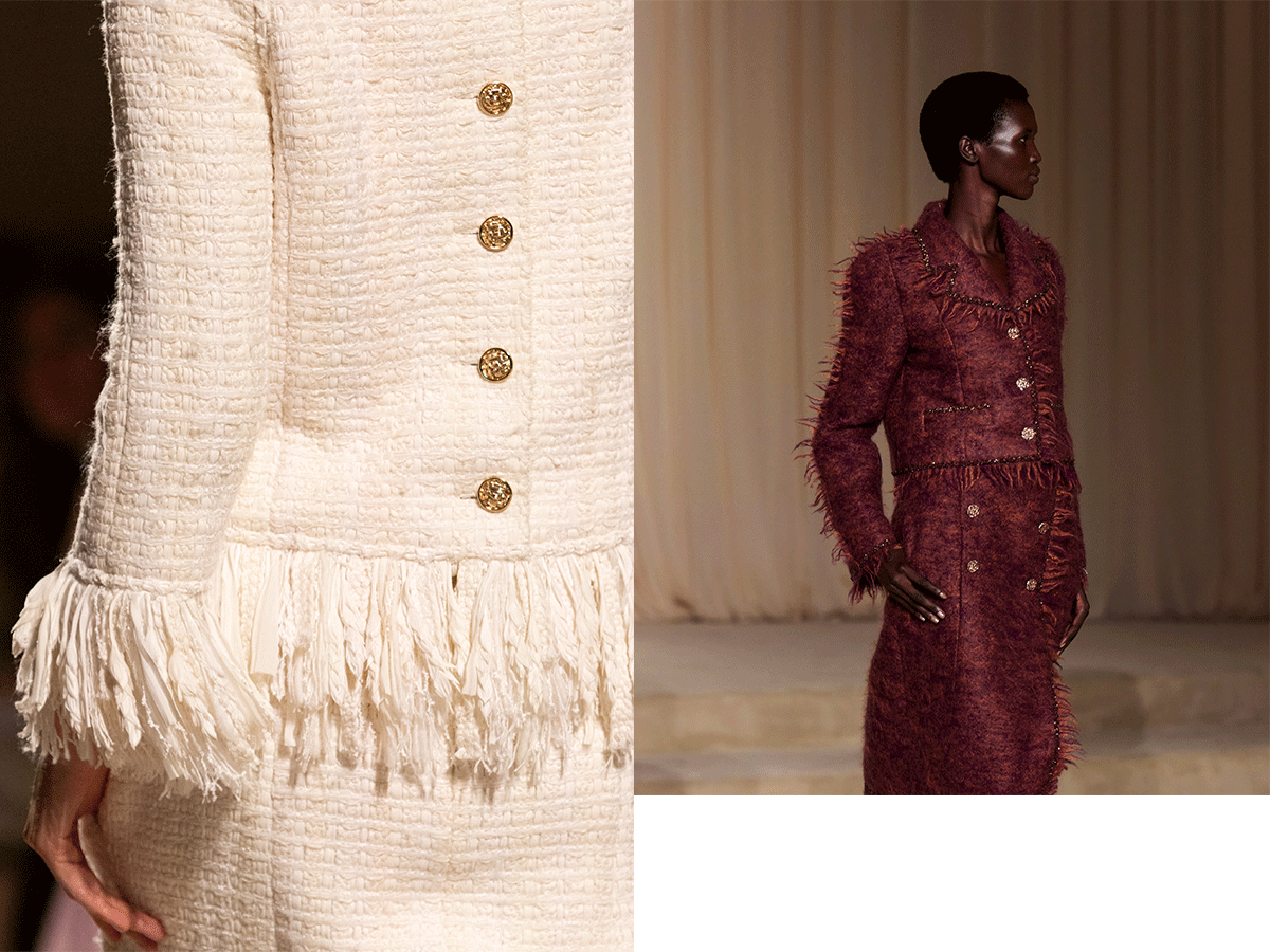 かつて、メンズウェアから着想を得た新鮮なシルエットでレディスウエア界に一石を投じた、ガブリエル・シャネルが提案したスーツ。それは、女性たちの身体を締めつけることなく、自由な動きを与えたことで、レディスウエアに革命をもたらした。そのスーツが今、モダンな感覚で蘇る。また今季はメゾンを象徴する素材、ツイードにも注目したい。ブレードがあしらわれたホワイトのコートドレスやセーターのように見えるジャケットスーツ、秋らしいグリーンやプラムカラーのモヘアのスーツなど、ニットのような素材感もシャネルらしい。ホワイトとブラックのストレートカットのコートドレス、スカートスーツとロングジレ、ペイントと刺繍が施されたアイボリーのショートパンツは、ブークレ ツイードを用いて、まるでシープスキンのような印象を与えている。