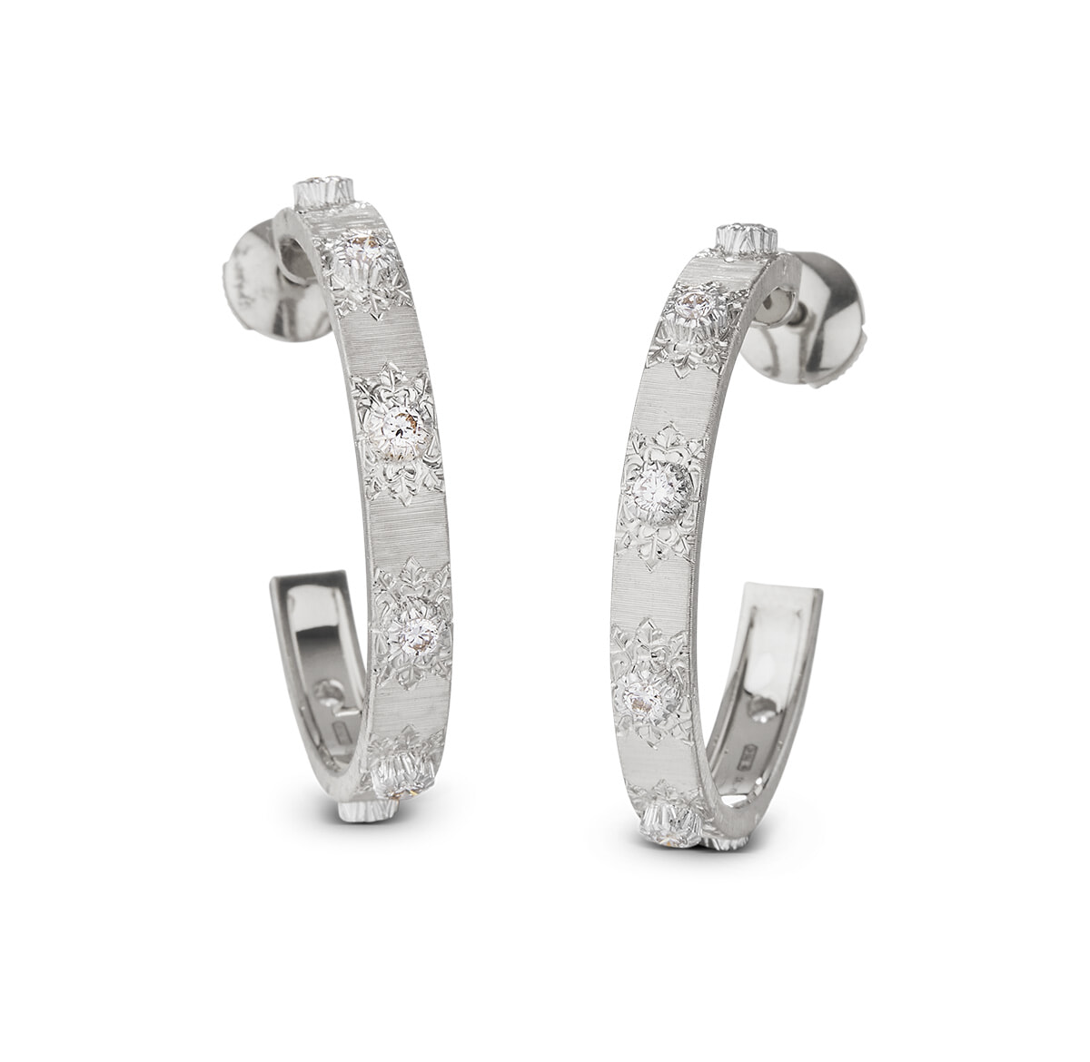純粋なラインと緻密な手彫りが特徴の「マクリ クラシカ」は、表面にリガート彫りを施し、繊細な「オルナート」技法によるモチーフで縁取られたセッティングにダイヤモンドをあしらって。フープイヤリング「マクリ クラシカ」(WG×ダイヤモンド)¥2,035,000/ブチェラッティ