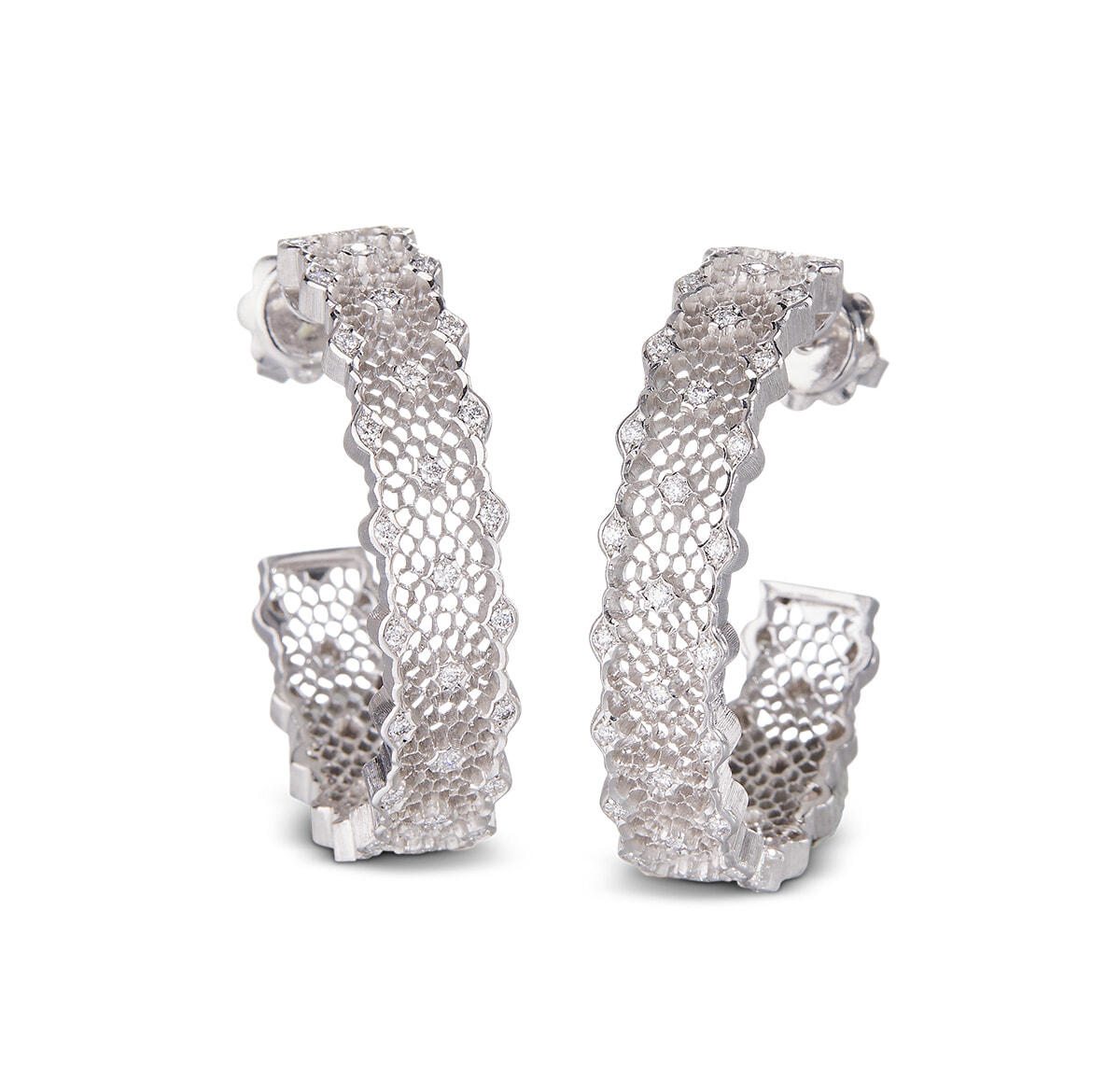 メゾンの象徴とも言える複雑なハニカム細工を用いた芸術性の高いイヤリングは、まさに職人技の賜物。フープイヤリング「チュール」(WG×ダイヤモンド)¥3,465,000/ブチェラッティ