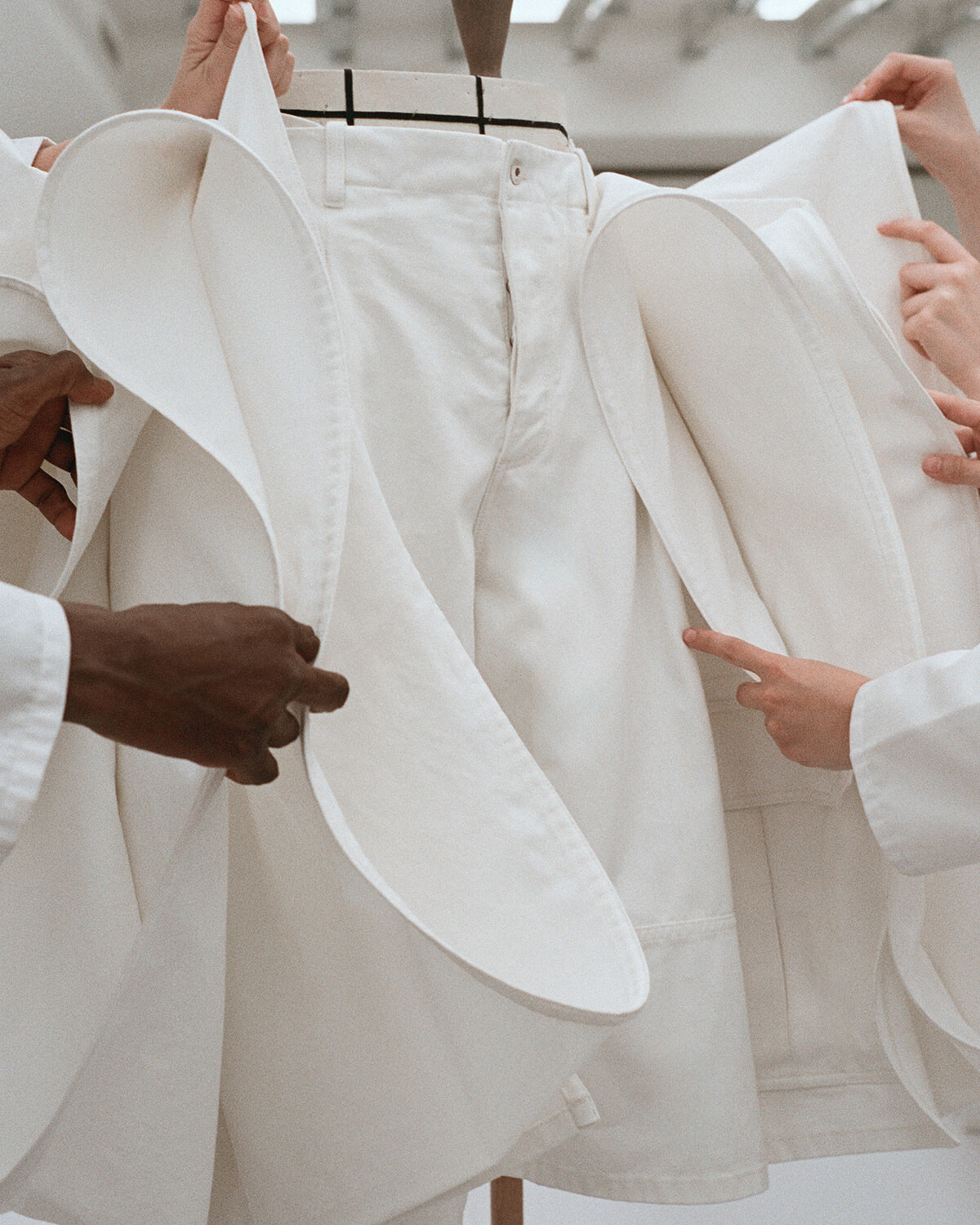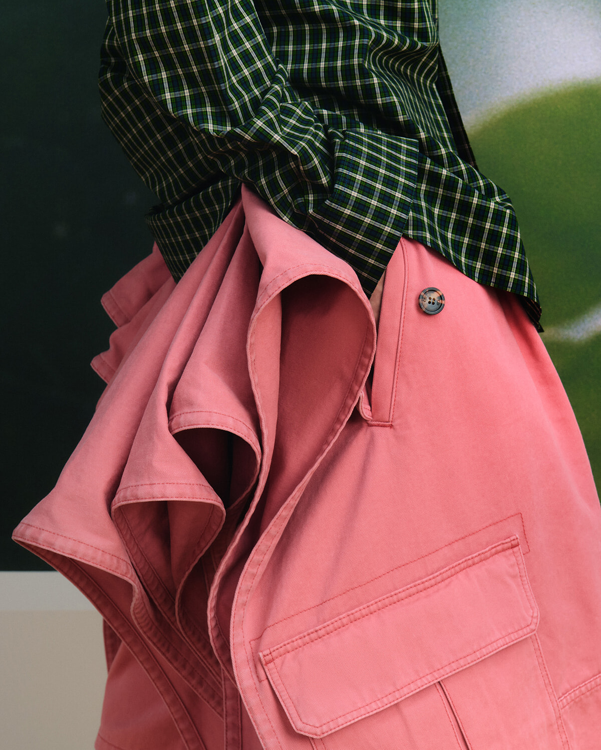 正面から見た時に張り出したように見えるサイドの膨らみは、生地を折りたたみ重ねたパネルにより形作られる。カーゴパンツ風に仕立てて現代的に再構築した。photography: Paul Lehr