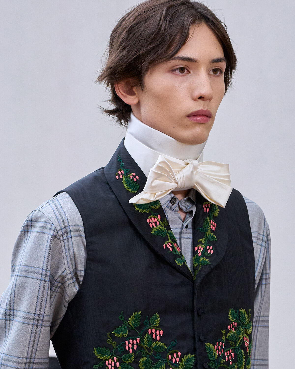 葉の刺繍に使用された糸は、3つの異なる色調のグリーンに染められて陰影がつけられている。ランウェイではハイカラーのボウタイと合わせてより高貴なムードを演出。