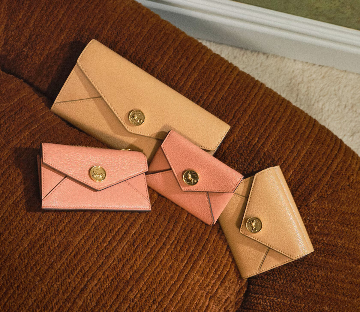 左下:スモールパース「エンベロープ」(H8×W13cm)¥59,400 左:同ロングウォレット(H12×W20cm)¥110,000 中:同カードホルダー(H8×W10.5cm)¥50,600 右:同スモールトリフォールドウォレット(H10×W11cm)¥89,100/以上クロエ(クロエ カスタマーリレーションズ)