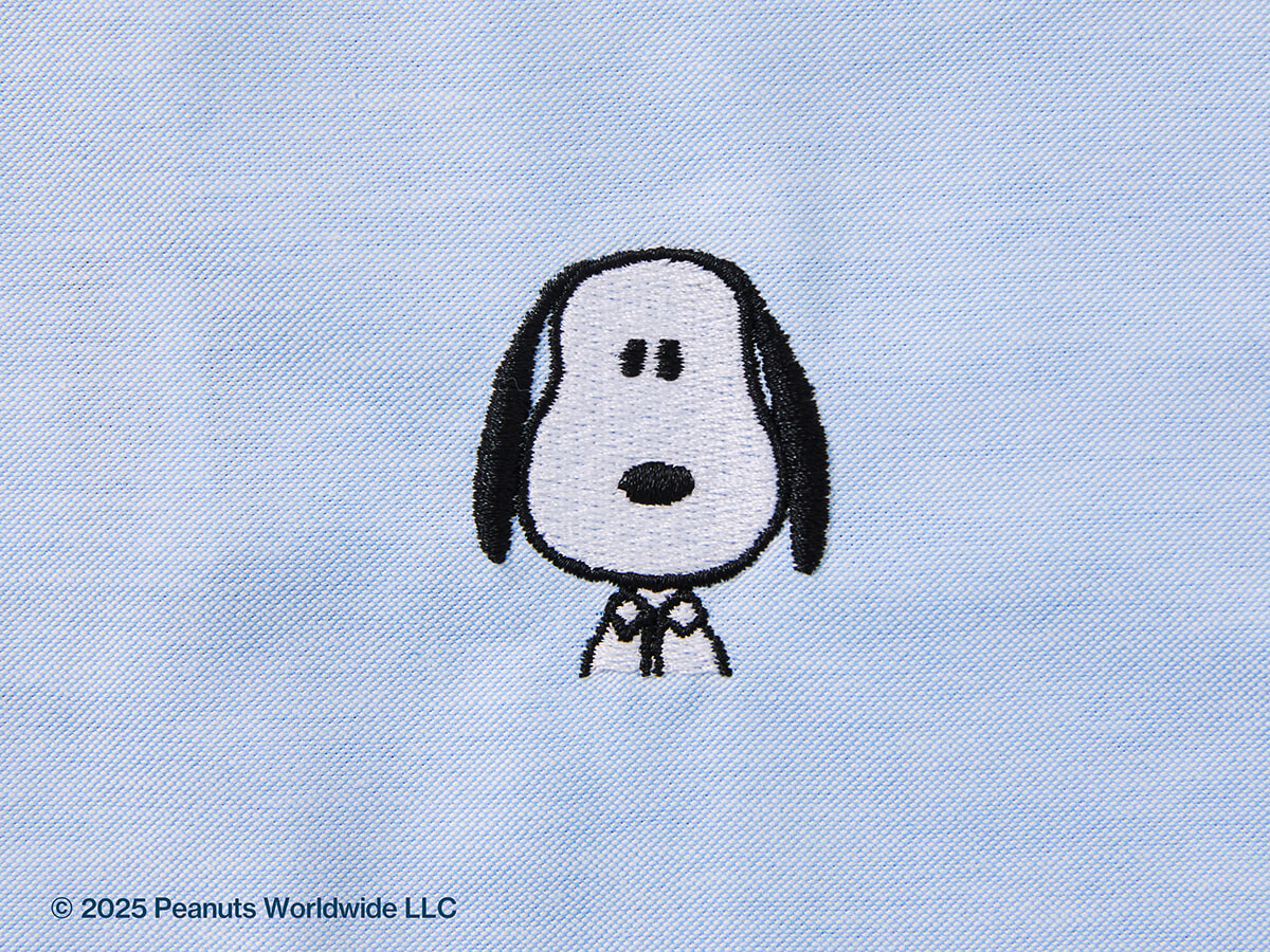 白シャツを着て正面を向いたスヌーピーの刺繍も、全国リテール店舗とオンラインストア共通。