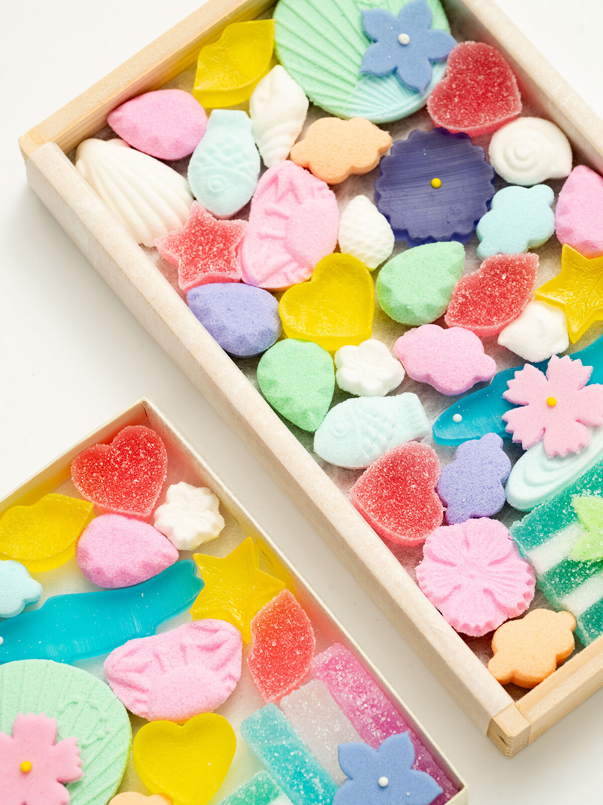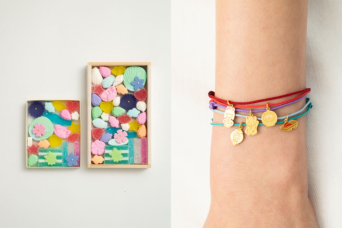 淡い色合いの落雁でかたどった雲や宝石、発色豊かなゼリーと琥珀で表現された唇、星、ハートなど、すべてがこのコラボレーションのために特別に仕立てられたもの。木型やゼリー型、色の配合に至るまで、職人の手で一つひとつ丁寧に作り上げ、仕上げにはこの企画のための特別な熨斗も添えてある。ギフトにも大いに喜ばれそうな干菓子もぜひ手に入れたい。