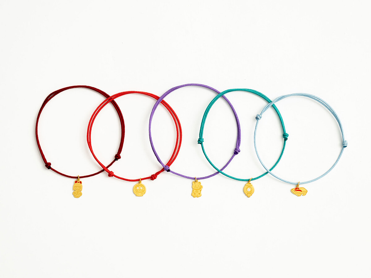 マリーエレーヌ ドゥ タイヤックの別注品は、人気のペンダント付きコードブレスレット。色とりどりのコードに、ダルマや下駄、舞妓さんなど和モチーフのペンダントをあしらったデザインは、単独でもレイヤードでも楽しめるのが魅力。手持ちのブレスレットと組み合わせて自分だけのスタイルを見つけて。