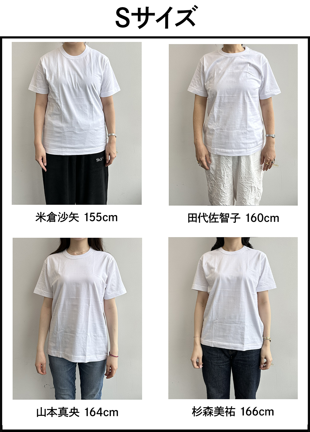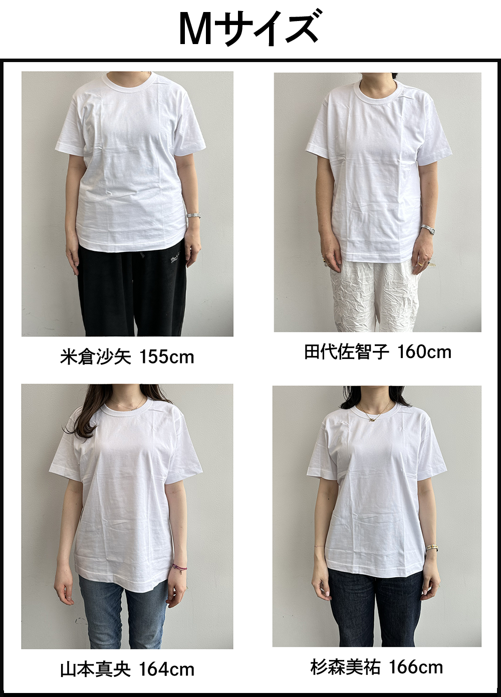 杉森(右下):ユニセックスだからか、Sサイズでも比較的ゆったりと着られるサイズ感。身幅はコンパクトながら着丈が長めなので、パンツやスカートにタックインする方に勧めたい。1枚出着るならSサイズ、インナーとして着るならMサイズ。