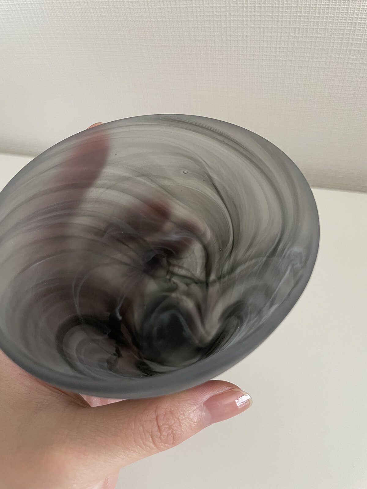 つるっと、ではなく、さらっとした手触りのマットなカップ。ガラスなのに不思議な質感です。漂う煙のような、水に落ちてゆく墨のような、柔らかく神秘的な模様で、光にかざすと仄かに透き通る。一見ガラスとは思えない儚いニュアンスがたまらなく愛おしいのです。お茶やお水などを入れてグラス使いするのはもちろん、口が広いので意外と蕎麦猪口なんかにもなりそう。