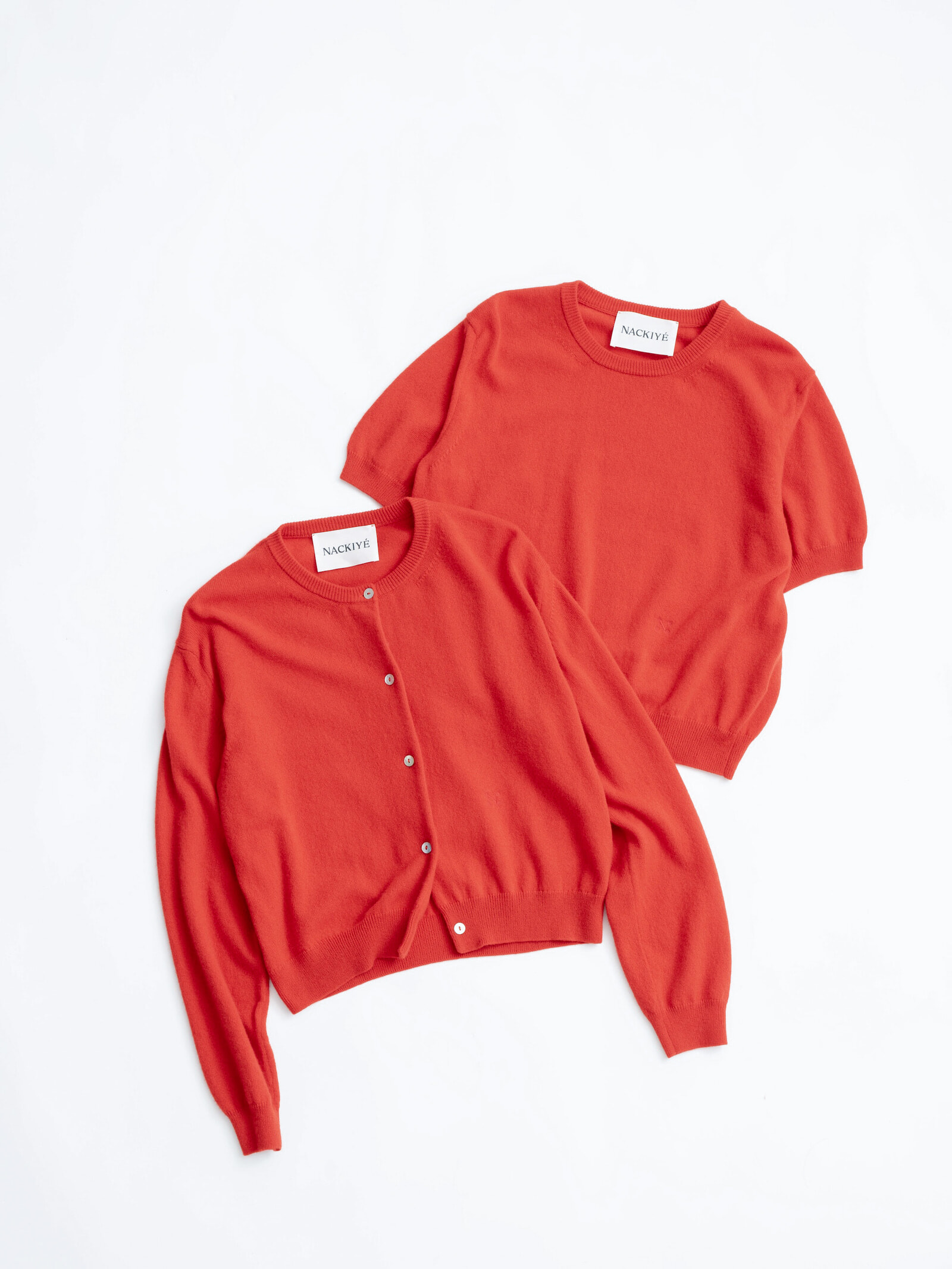 シーシェルカシミアカーディガン (レッド) ¥132,000、パールカシミアショートスリーブクルーネック (レッド) ¥110,000