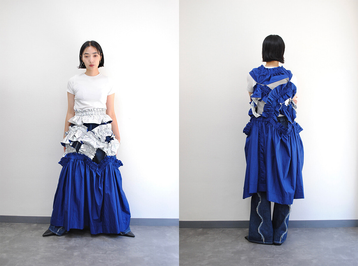 昨年も好評だったこのポップアップツアーは、ドレスから小物まで最新アイテムを豊富に取り揃え、ホウガの世界観をよりいっそう感じられるイベントとなっている。目玉は、ホウガのシグネチャーともいえるフリルドレスをカスタマイズできること! ホウガのフリルドレスは、体を通す位置やレイヤード次第でさまざまな表情を見せ、ドレスアップにもデイリーな装いにも、自由なスタイリングを楽しめるのが魅力。今回のカスタマイズは、リバーシブル仕様で生地は10種類から好きなものを2種類、90通りの組み合わせの中から選ぶことができる。ポップアップツアーの機会に自分好みの1着をオーダーしたい。