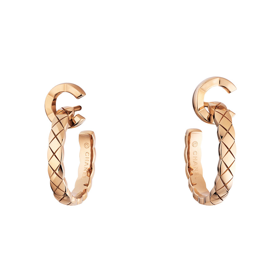 ダブルCを大胆に組み替えた遊び心あるイヤリング。ふっくらと立体感のあるキルティングがさまざまな角度から光を受け上品に煌めく。