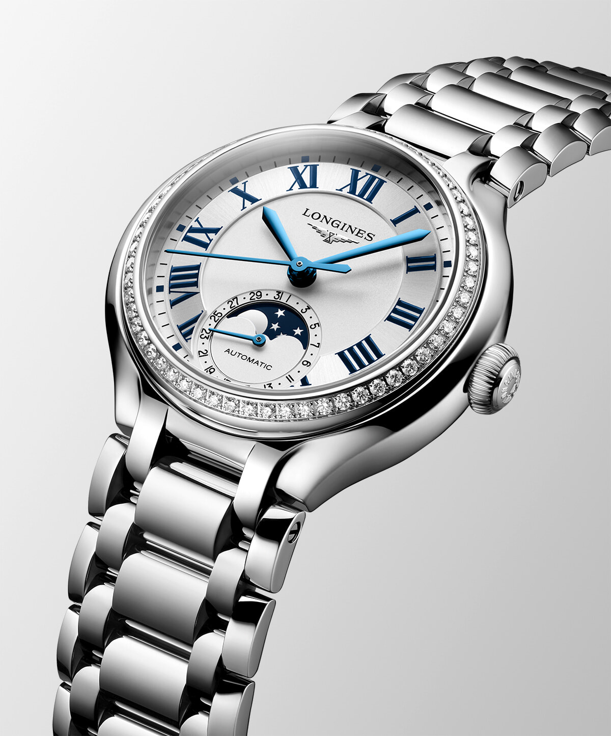 サンレイシルバーダイアルにダイヤモンドやブルーの針が映える。「ロンジン プリマルナ」(∅34mm、SS×ダイヤモンド)¥862,400/ロンジン(スウォッチ グループ ジャパン)