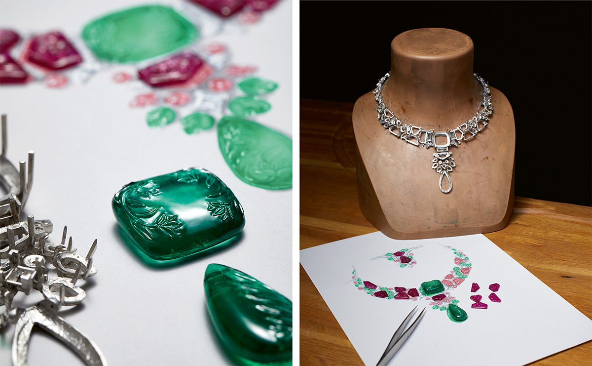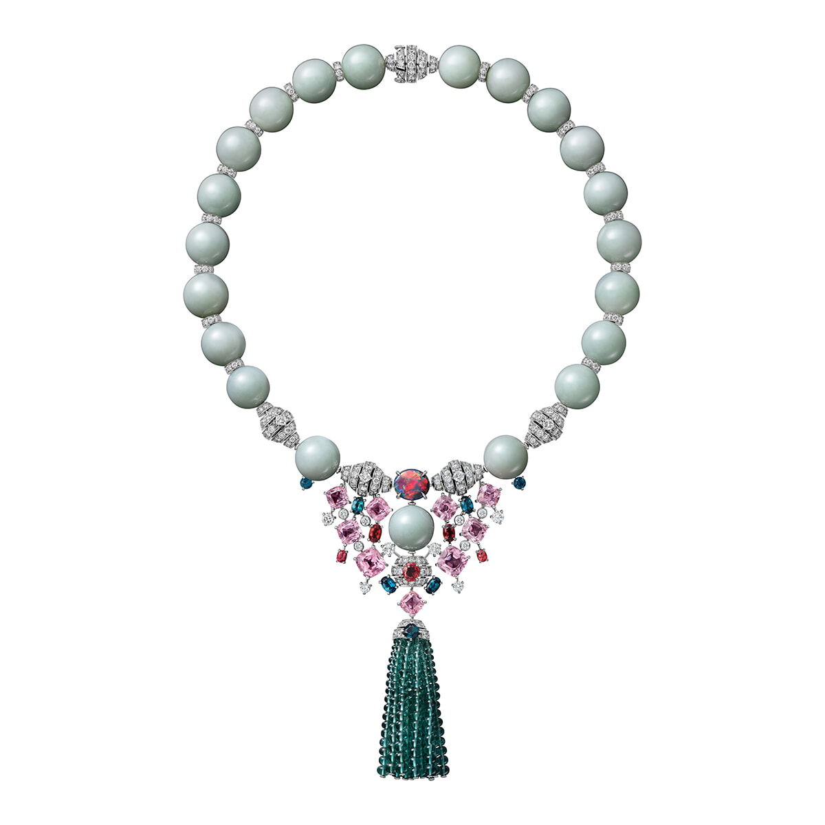 ネックレスの素材はプラチナ、スピネル、オパール、翡翠、トルマリン、ダイヤモンド。¥212,520,000(参考価格)Maxime Govet © Cartier