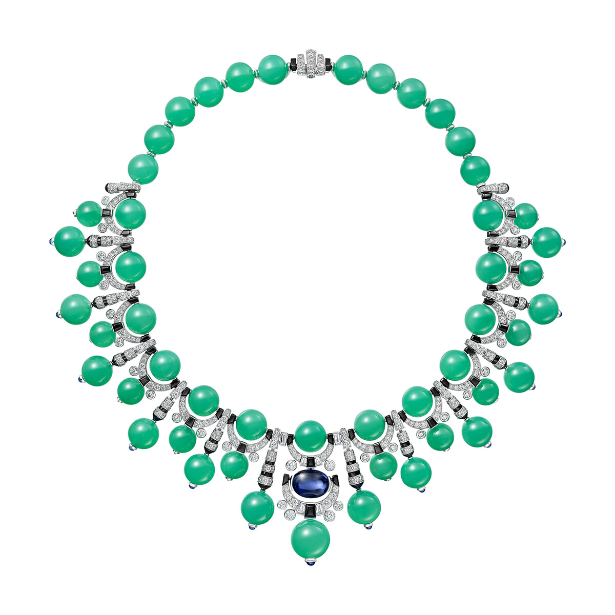 ネックレスの素材はプラチナ、WG、サファイア、クリソプレーズ、オニキス、ダイヤモンド。¥172,920,000(参考価格)Maxime Govet © Cartier
