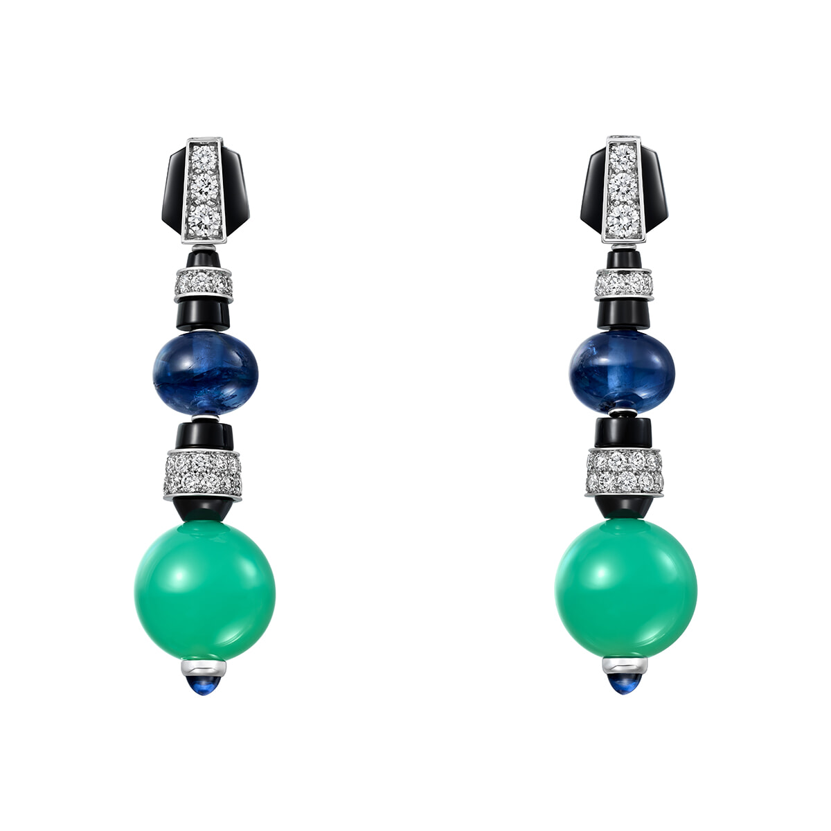イヤリングの素材はプラチナ、WG、サファイア、クリソプレーズ、オニキス、ダイヤモンド。¥30,888,000(参考価格)Maxime Govet © Cartier