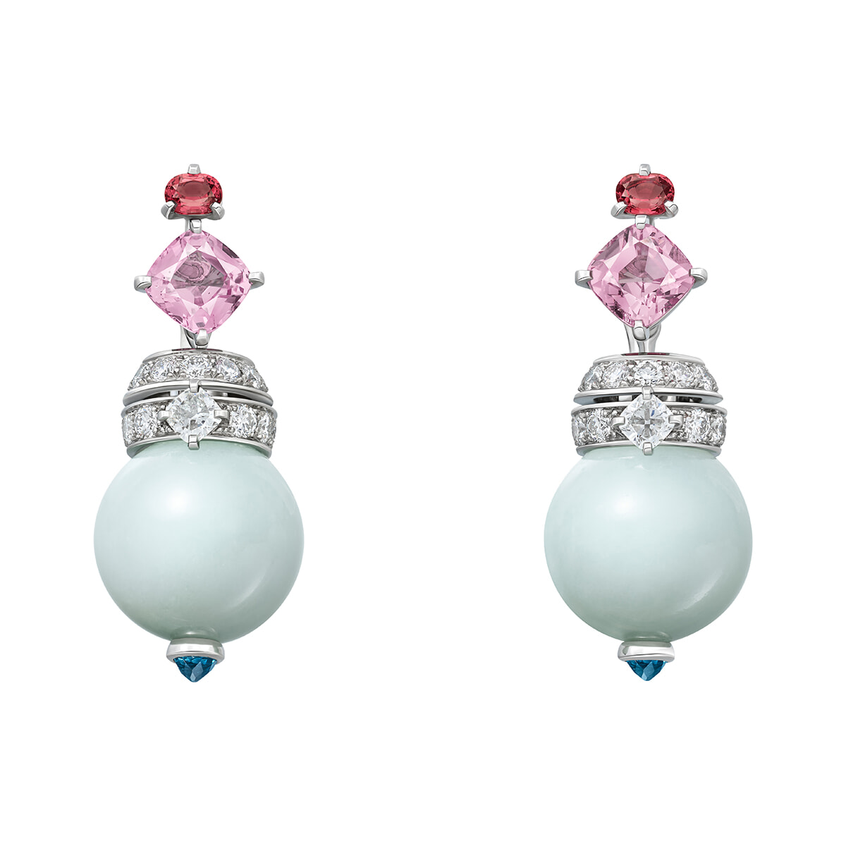 イヤリングの素材はプラチナ、スピネル、翡翠、トルマリン、ダイヤモンド。¥36,696,000(参考価格)Maxime Govet © Cartier