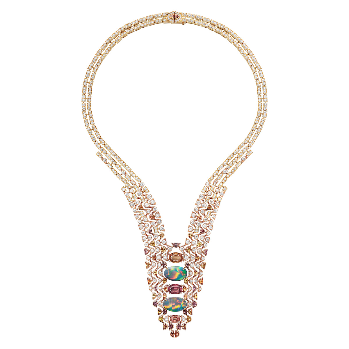 カフェイエテも、色の組み合わせの見事なバランスを物語っている。目を奪うような虹色の輝きを放つふたつのオパールを挟み込むようにイエロー、オレンジ、赤のサファイアを配置。ネックレスのイエローゴールドとピンクゴールドが織り成すメッシュ部分では、ウンバサファイアが輝く波を描いている。命名は赤い岩肌の山で有名なアルゼンチンの観光地であるカファイエテから。