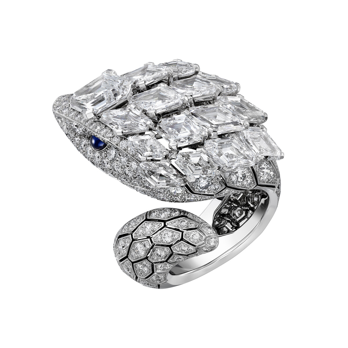 コレクションのジュエリーは、ラテン語やイタリア語など様々な言葉の名前が付けられている。この指輪とイヤリングのセットはシロヘビと日本語名だ。蛇はカルティエの動物寓話集の中でも象徴的存在。六角形のステップカットのダイヤモンドセッティングは幾何学的な鱗をリアルに表現し、白い輝きに囲まれたサファイアのブルーの目は鋭く射るようでもあり、なんとなく微笑んでいるようでもあり……。揃いのイヤリングには、リングのグラフィカルな魅力が生かされている。