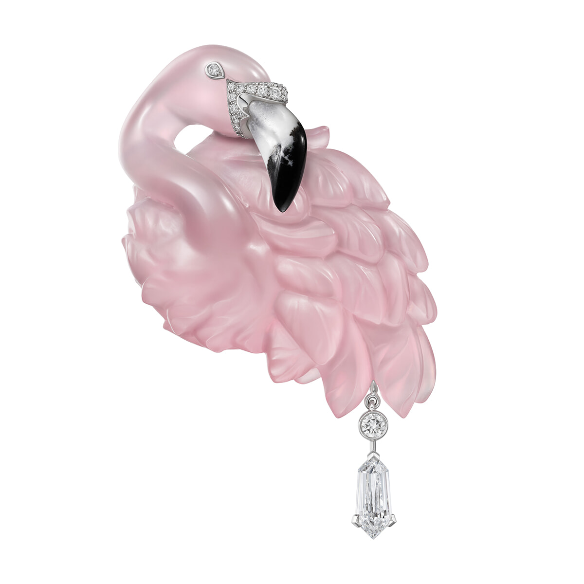 ケニアの湖の名前が付けられたピンクフラミンゴのブローチ。素材はケニアで採れたピンククオーツで、それをメゾン内のグリプティック職人が羽毛に到るまでリアルで優雅なフラミンゴを彫り上げた。嘴には瑪瑙が用いられている。鳥の華奢な脚はカイト型のダイヤモンドで、ピンククオーツのボディと見事に調和するデザイン。1940年にウィンザー公爵夫人のために作られたブローチが過去にあるように、フラミンゴはメゾンが愛し、何度もモチーフとして登場する動物のひとつだ。