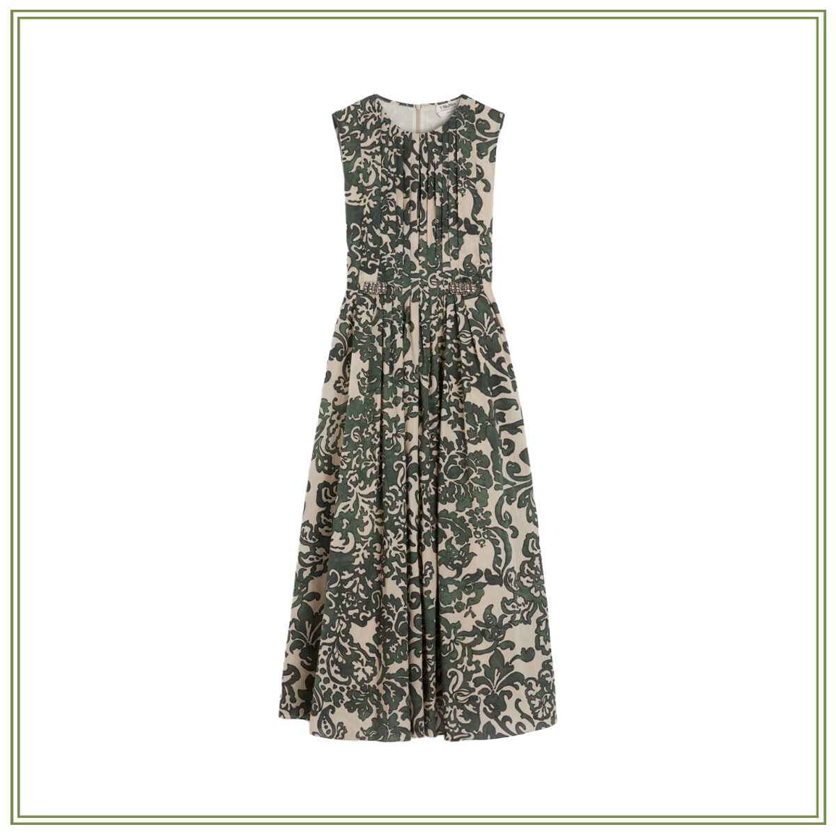 ボタニカルプリントをのせた上品な光沢感のあるテキスタイルを使用し、たっぷりのギャザーでふんわりとエアリーな着心地。フェミニンなAラインドレスのウエスト部分にあしらわれたビジューが、幸運をキャッチしてくれそう。
