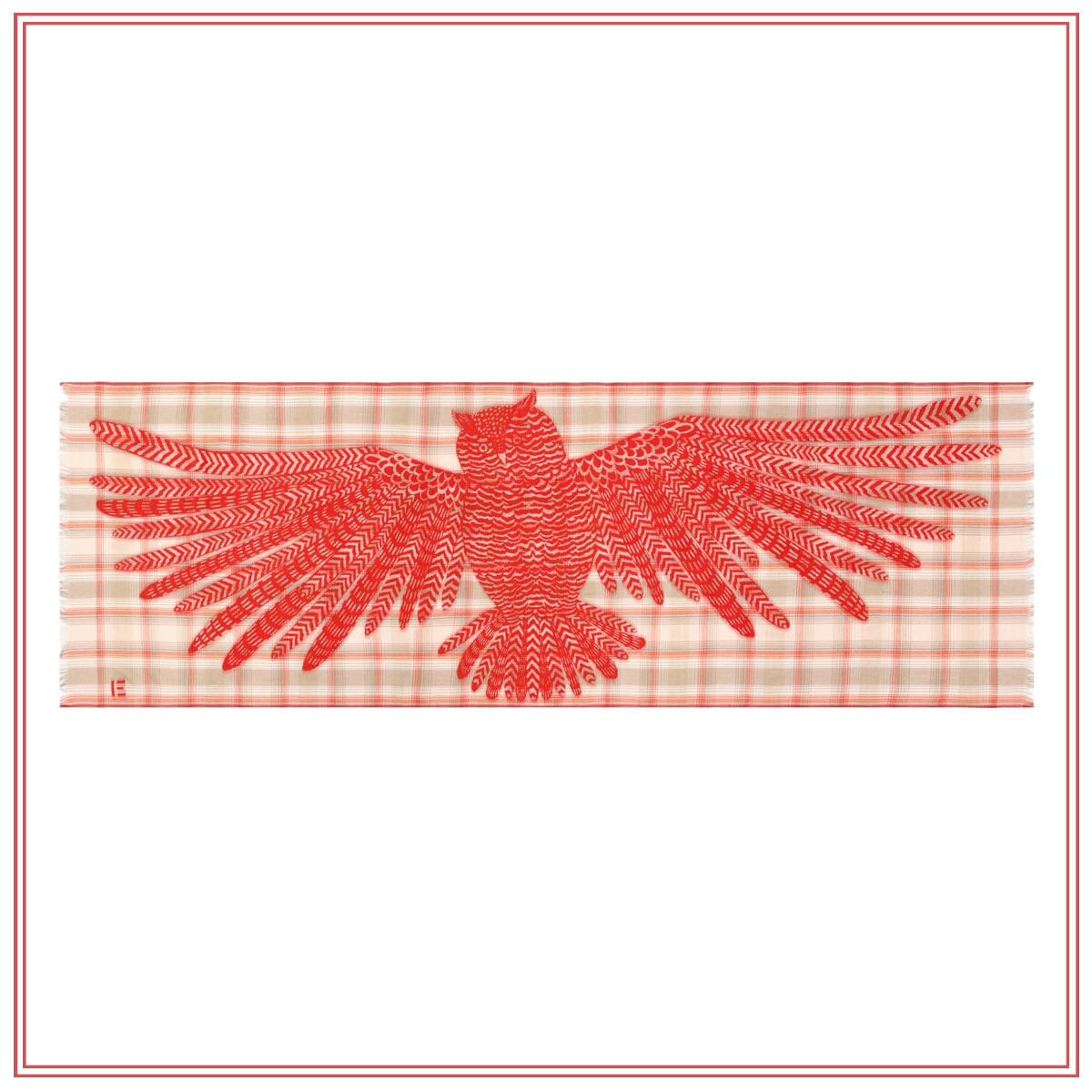ブリティッシュテイストのチェック柄ストールに、羽を広げ雄大に舞うフクロウを繊細に刺繍したストーリーを感じるデザイン。そのまま羽織れば、幸運までもやさしく包み込んでくれそう。