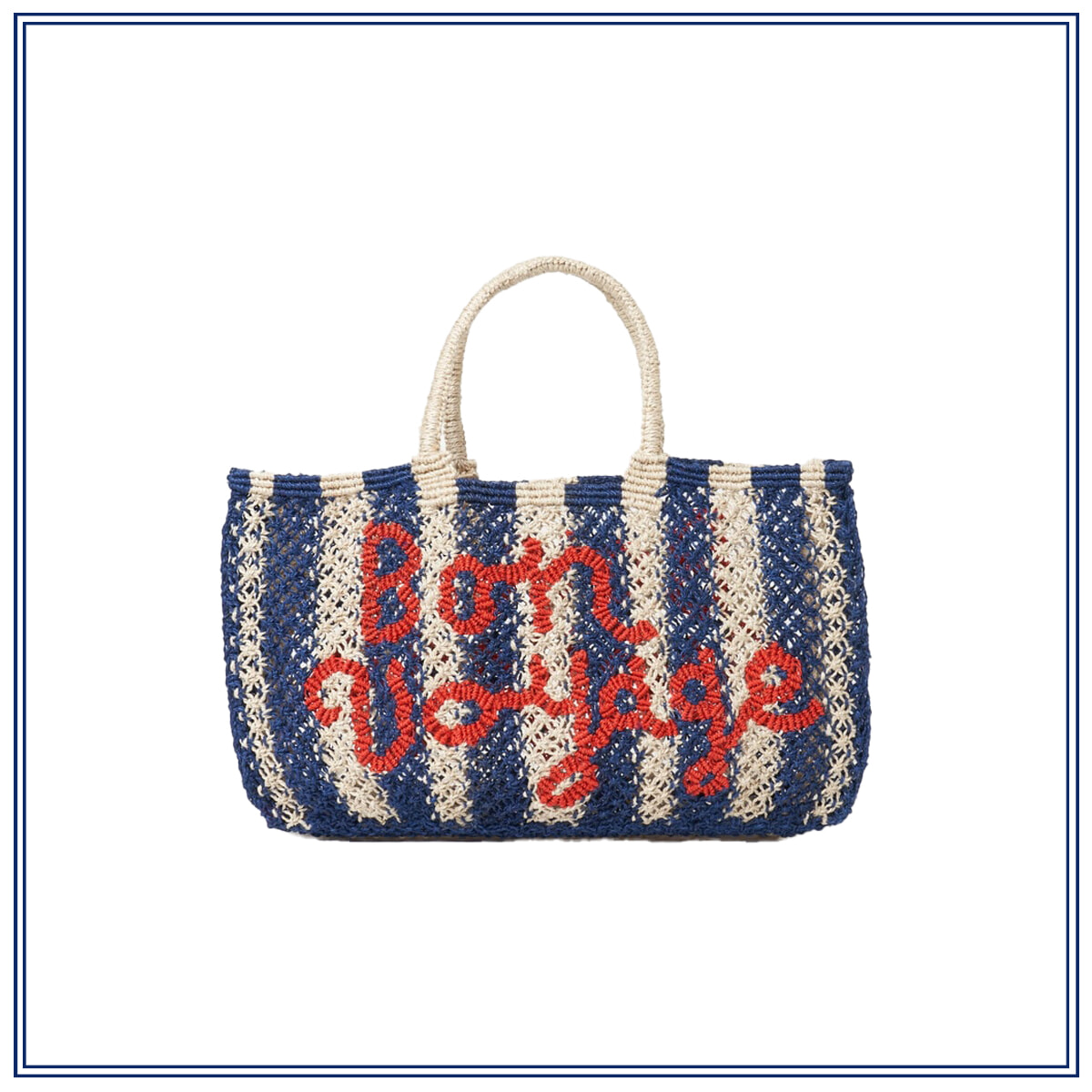 ストライプのボディに、鮮やかなスカーレットカラーで旅立ちの言葉「Bon Voyage」をのせたマリンテイストのバッグ。新たな冒険に心が高鳴るような、ポジティブマインドに満ちたデザインで運気がアップしそう。